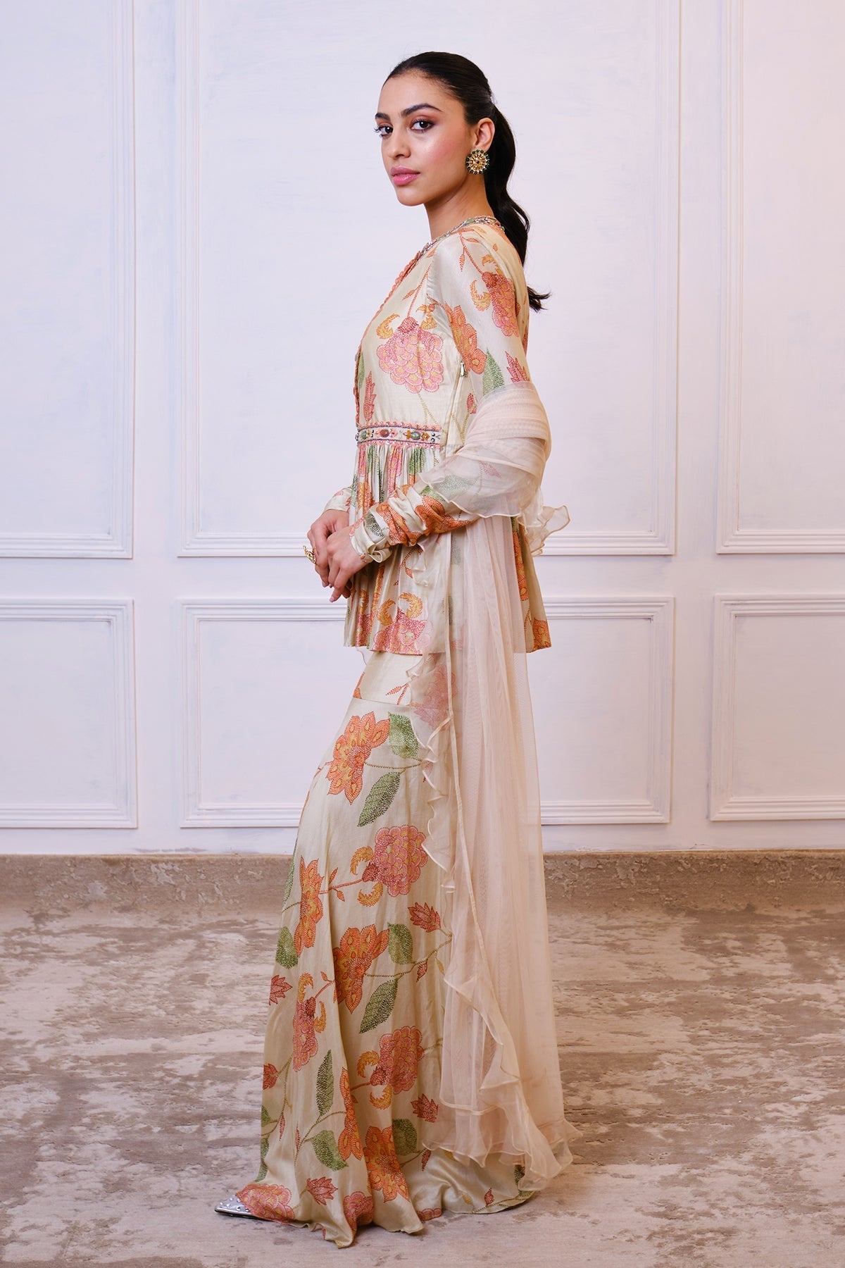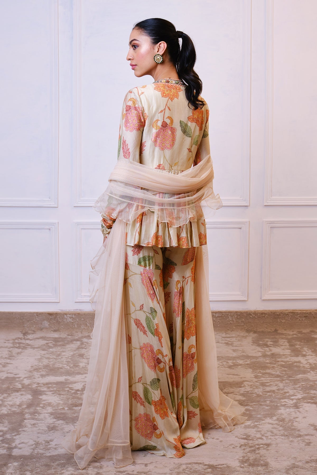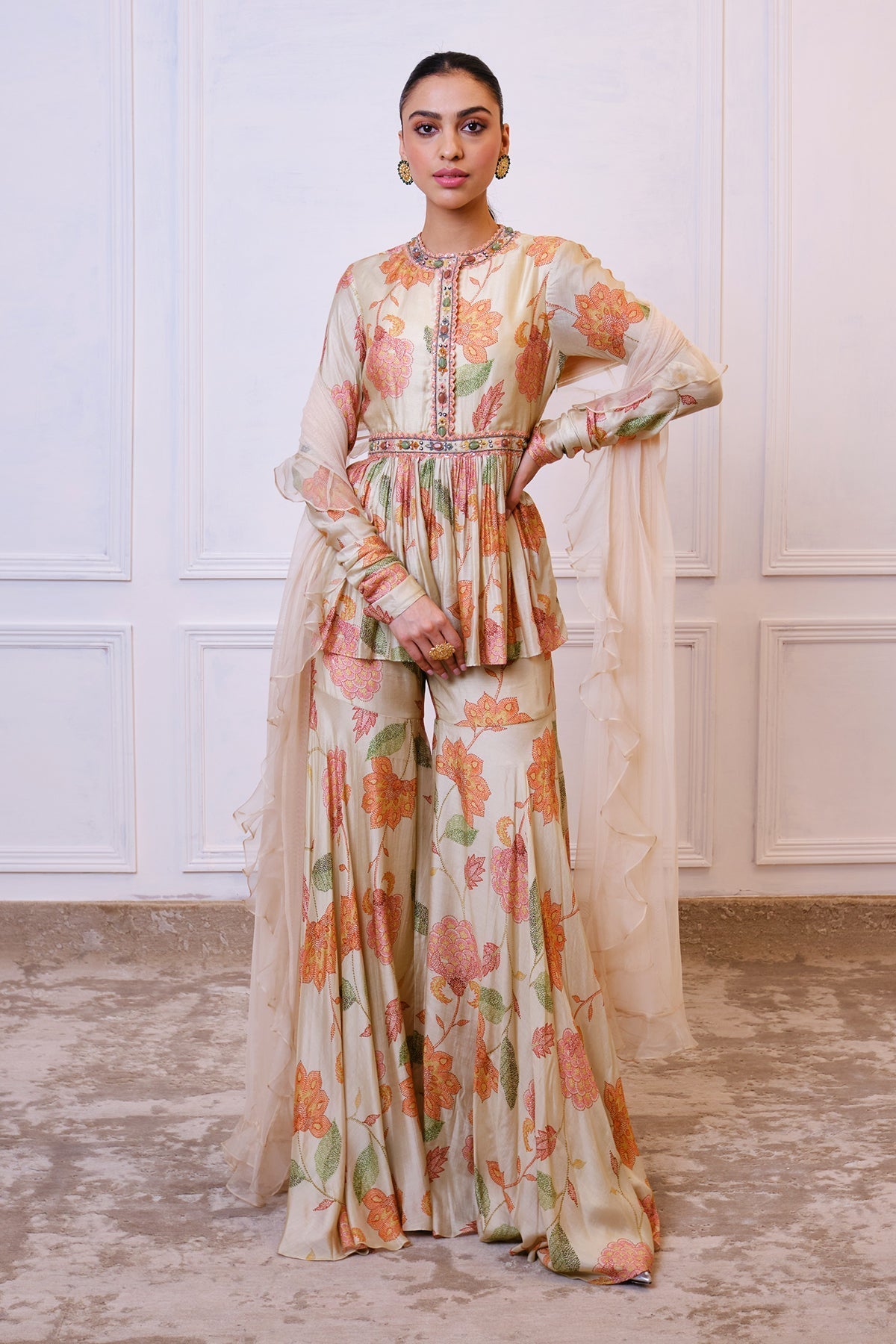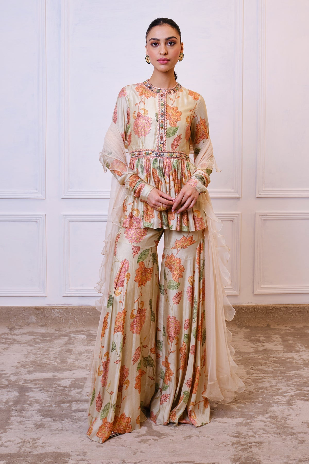 Printed silk peplum with embellished neckline paired with printed silk garara and net dupatta