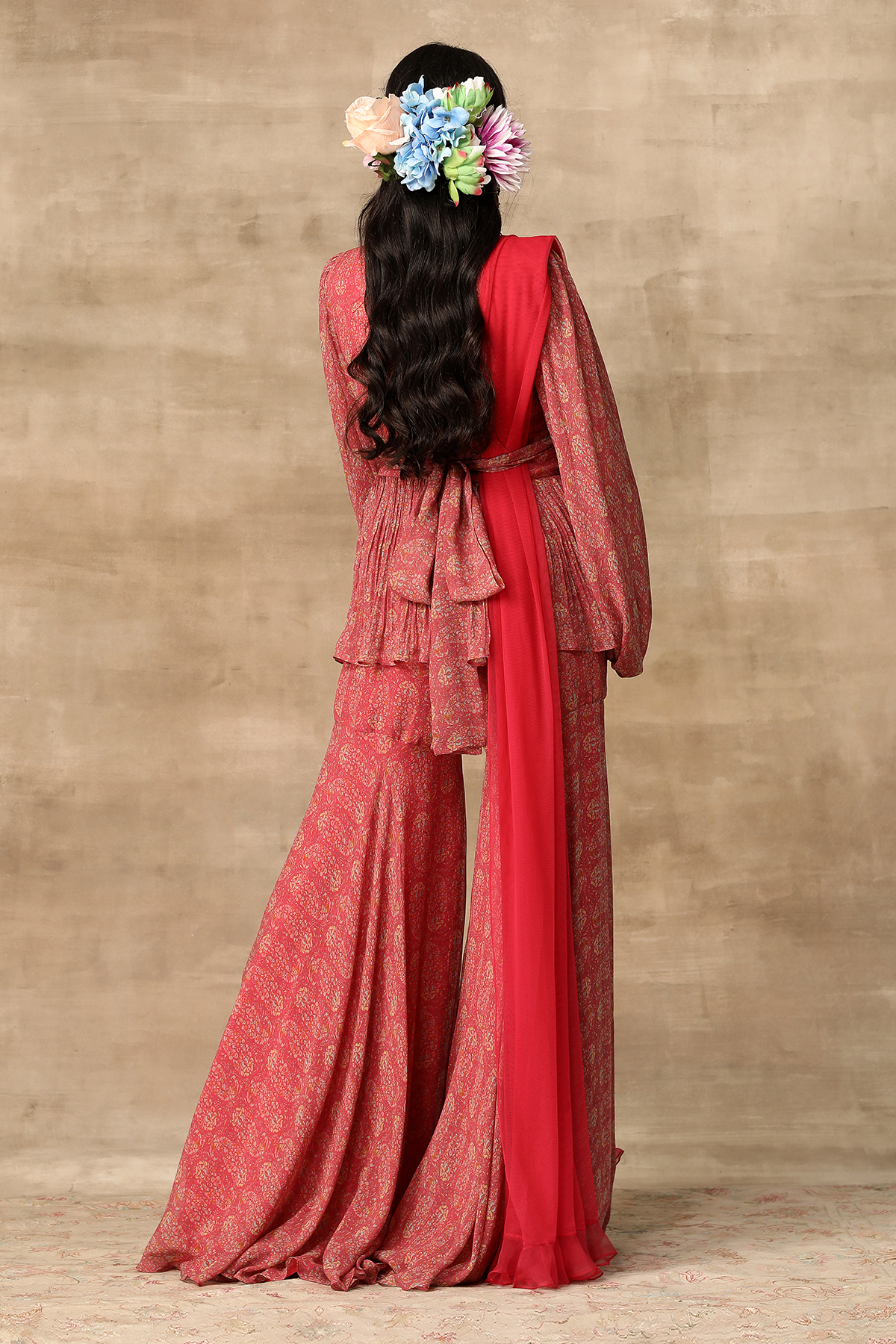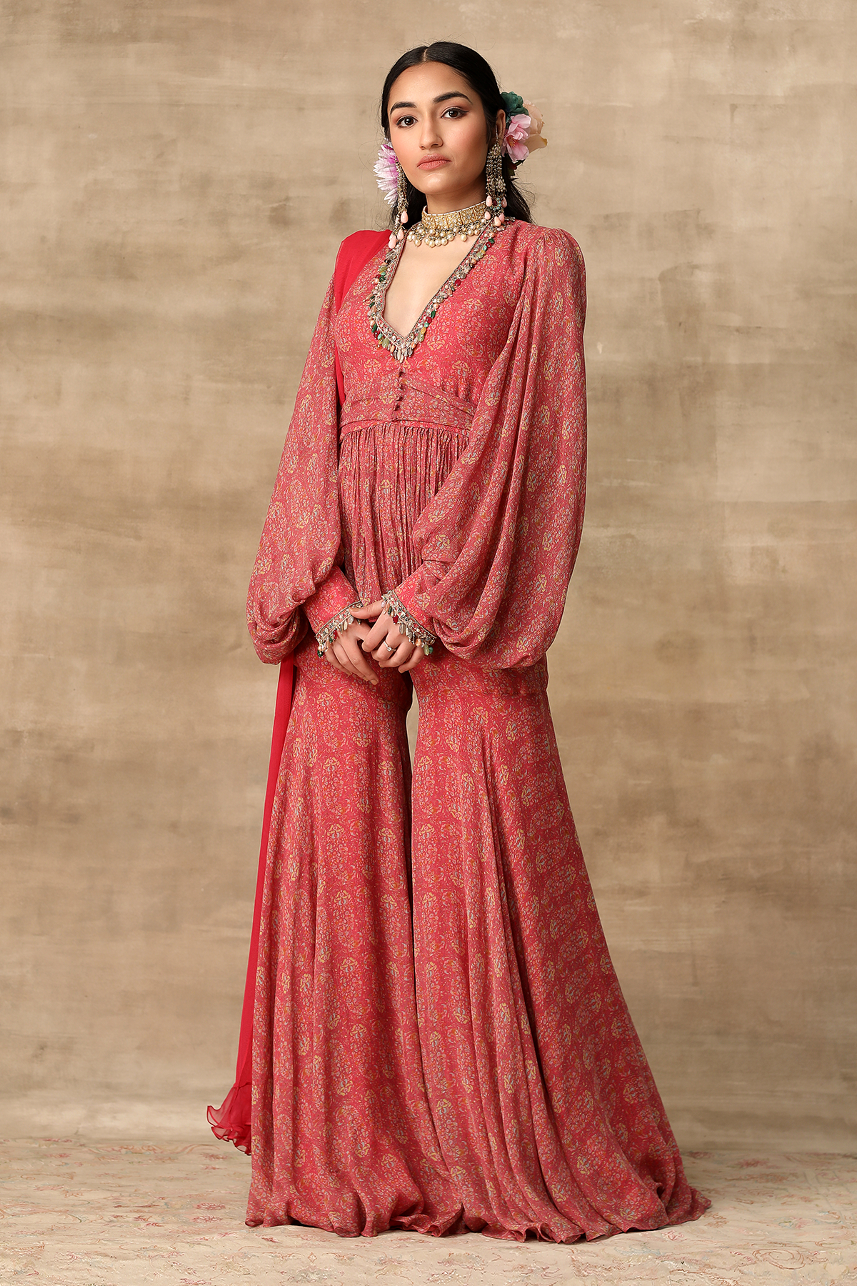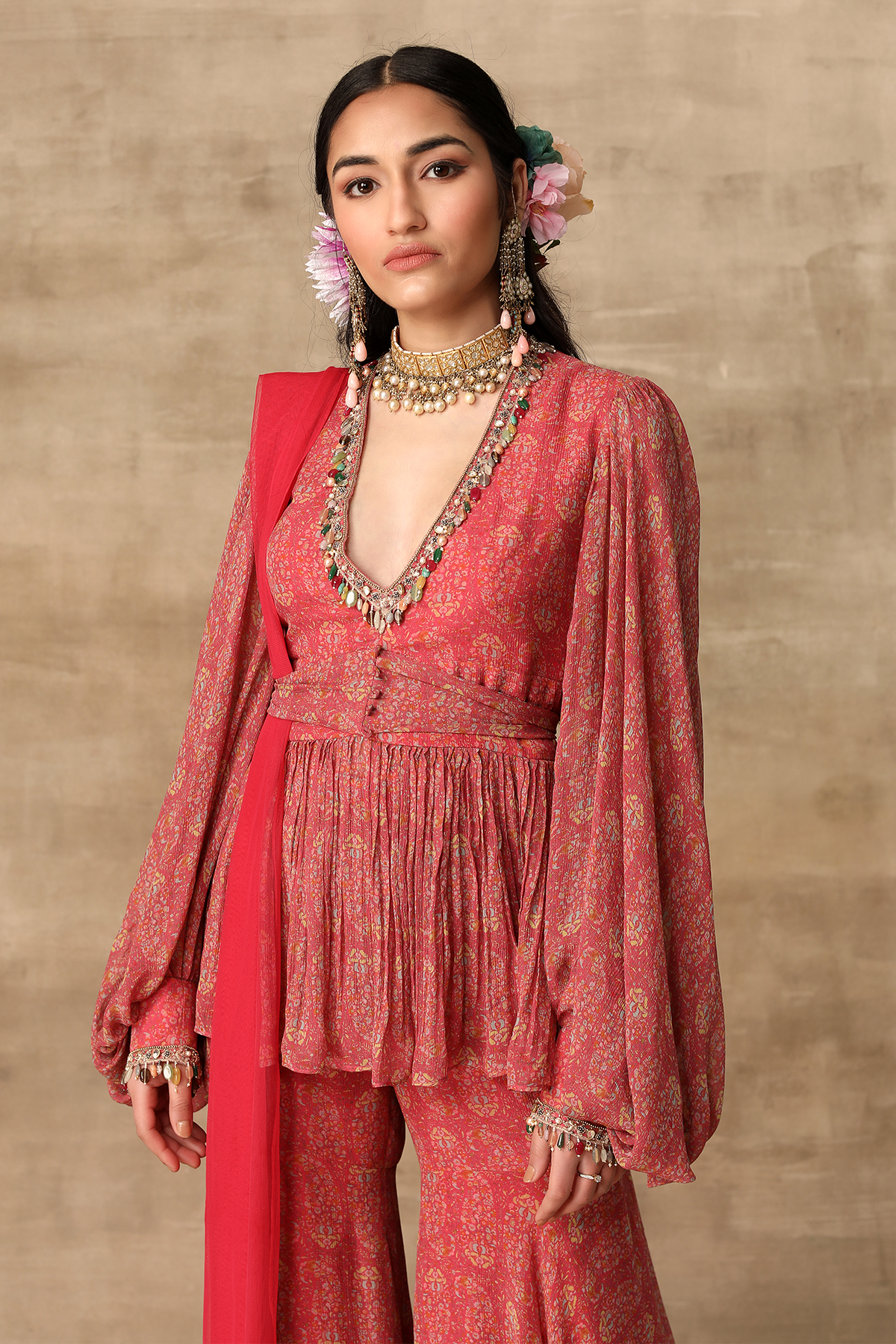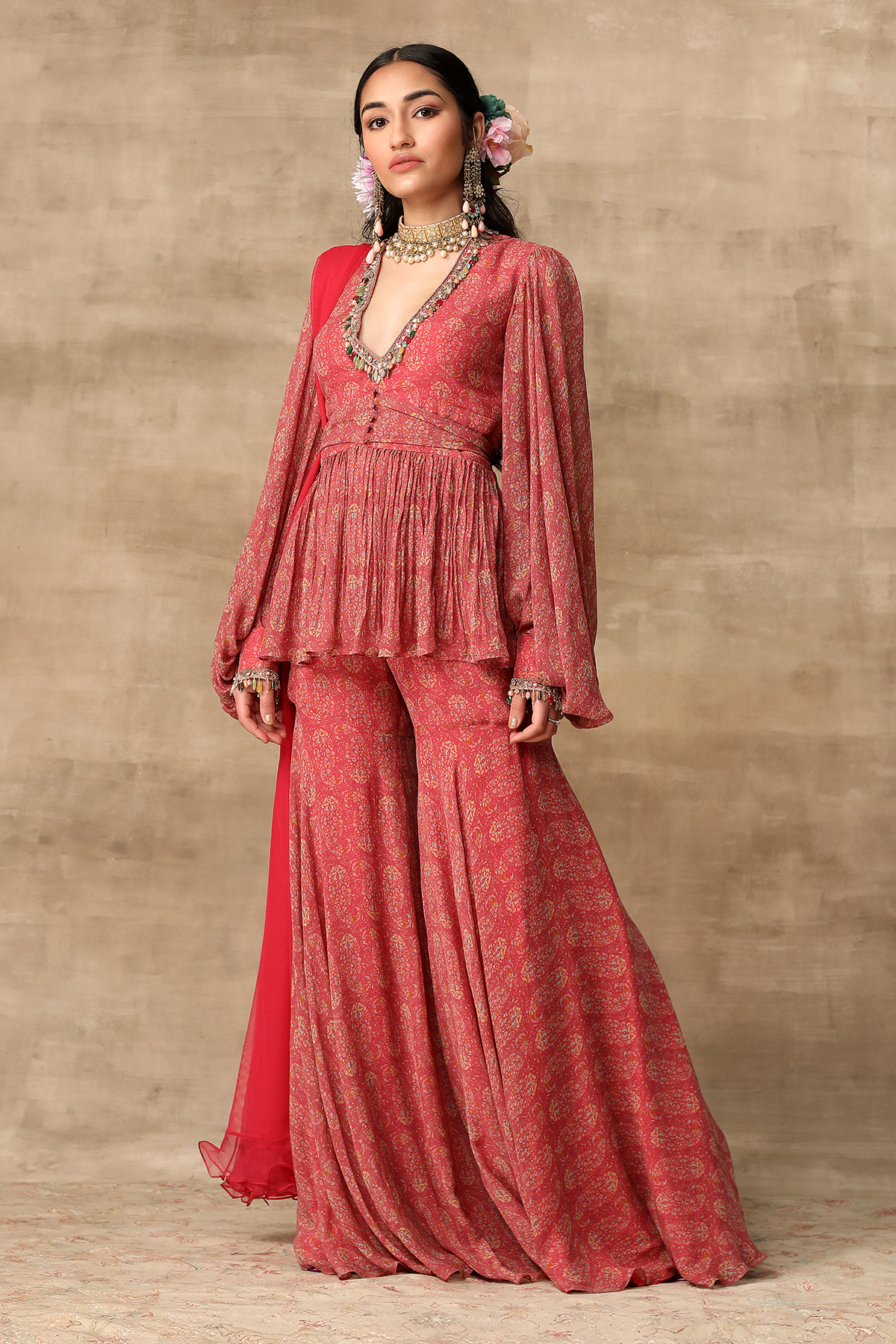 Deep coral paisley printed chiffon peplum with a multicolor jewel neckline and exaggerated sleeves and paisley printed gharara with net ruffle dupatta.