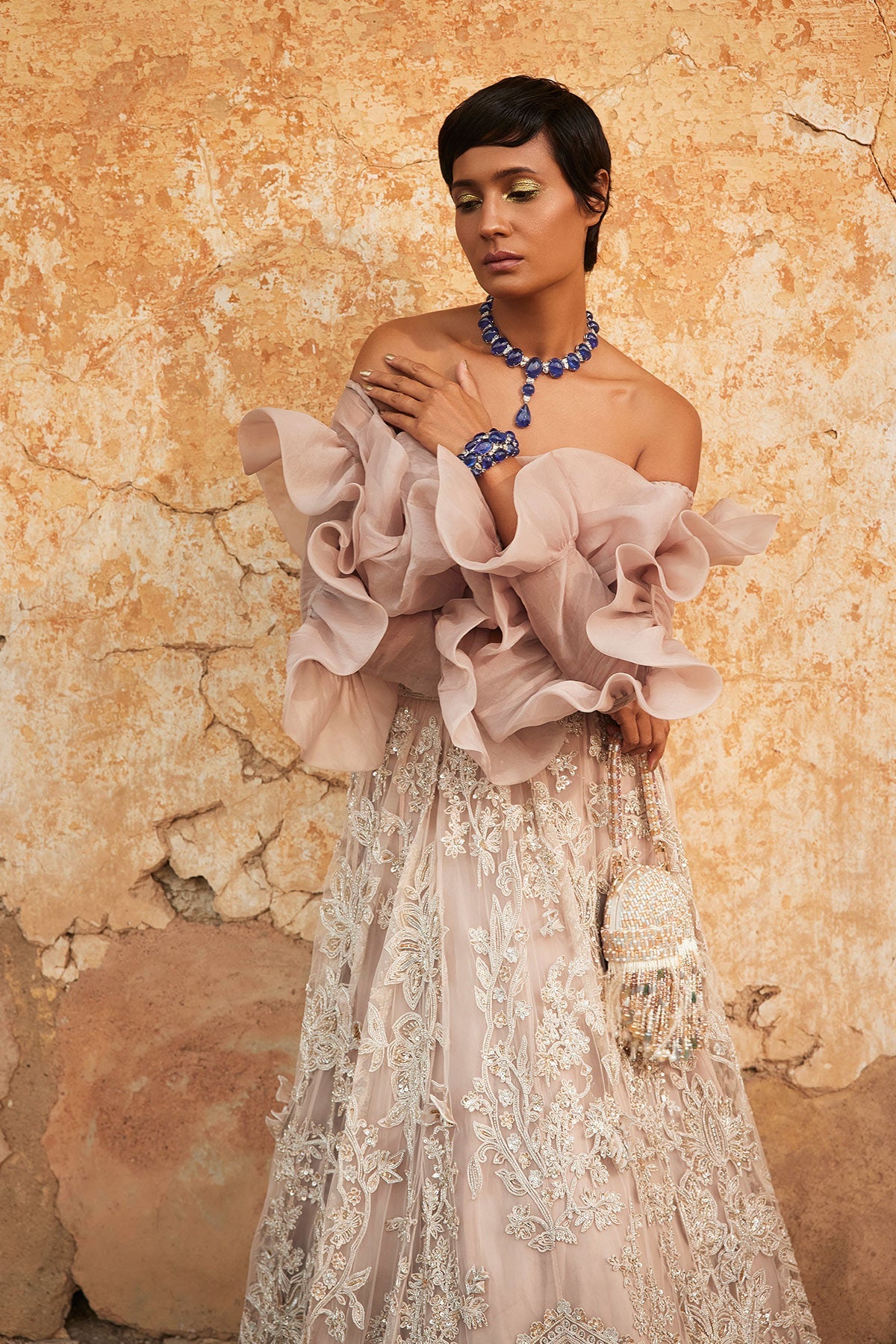 Champagne Organza Ruffled Top With Net Embroidered Lehenga