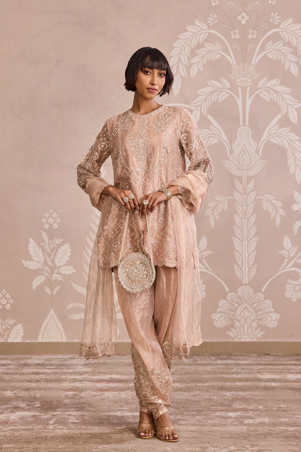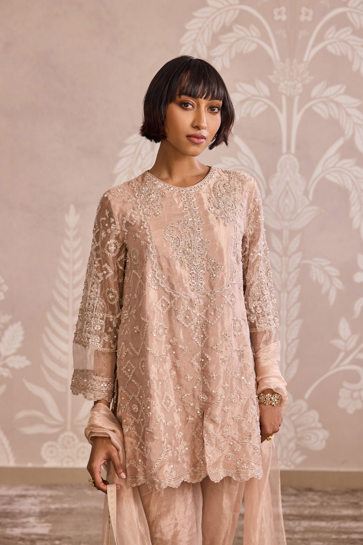 Allover Embroidered Tissue Kurta and Placement Embroidered Tissue Salwar Paired with Two Side Embroidered Border Tissue Small Width Dupatta