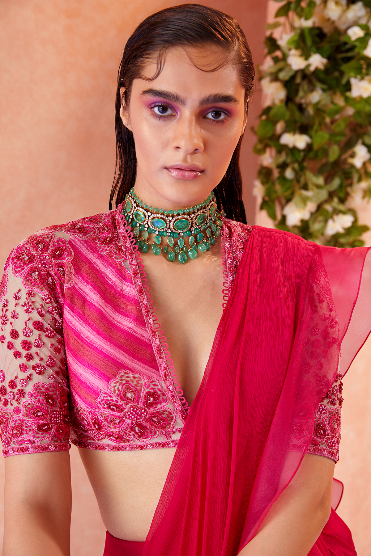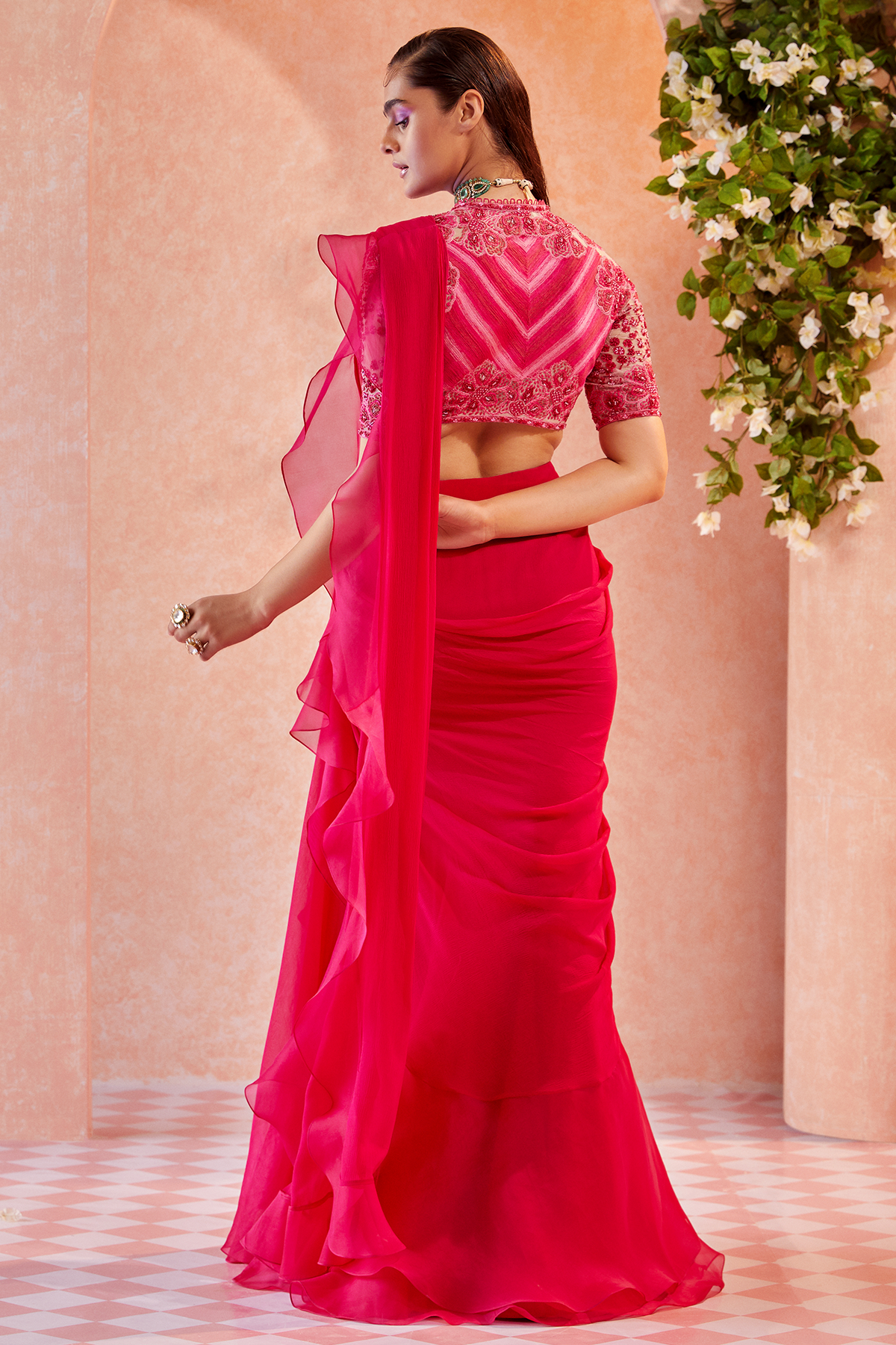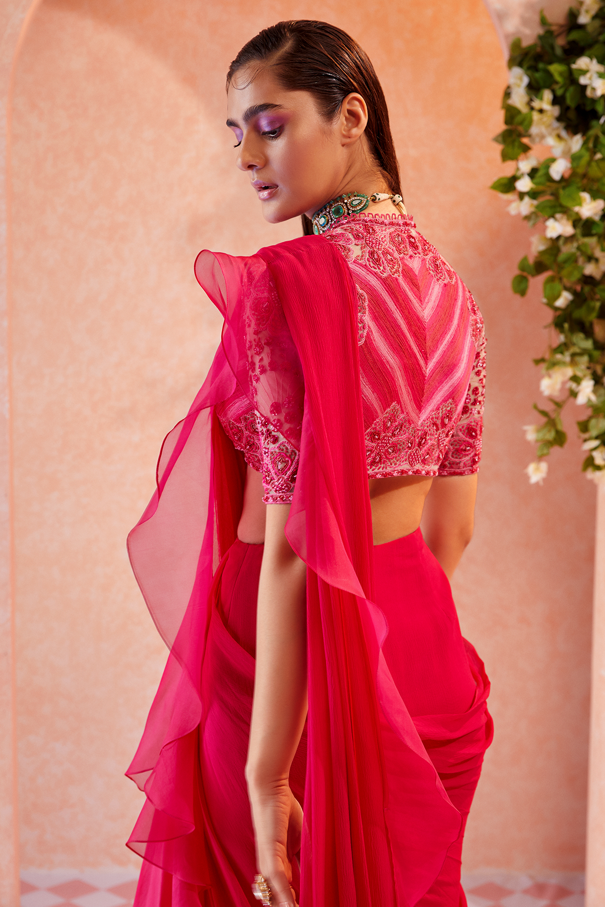 Champagne net blouse with fuschia embroidered and fuschia chiffon-organza draped ruffle saree