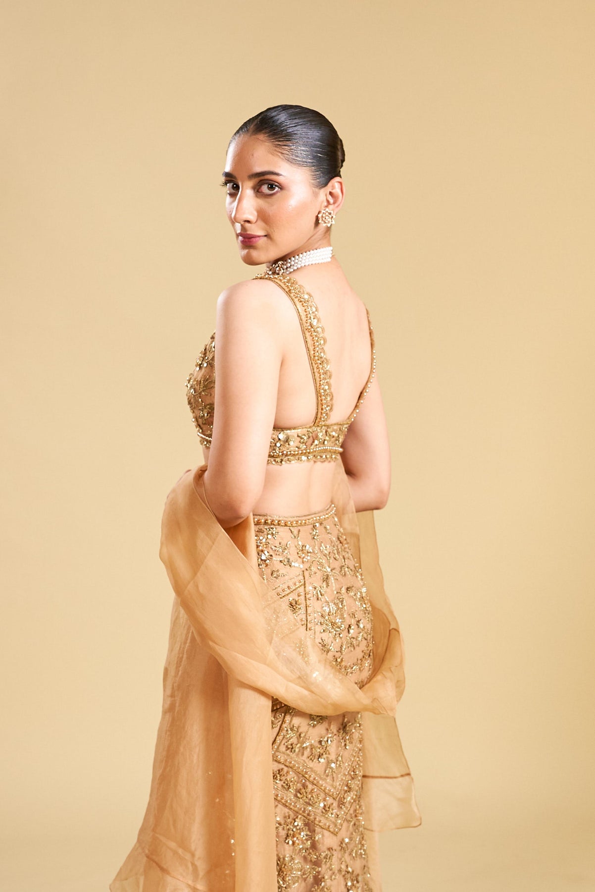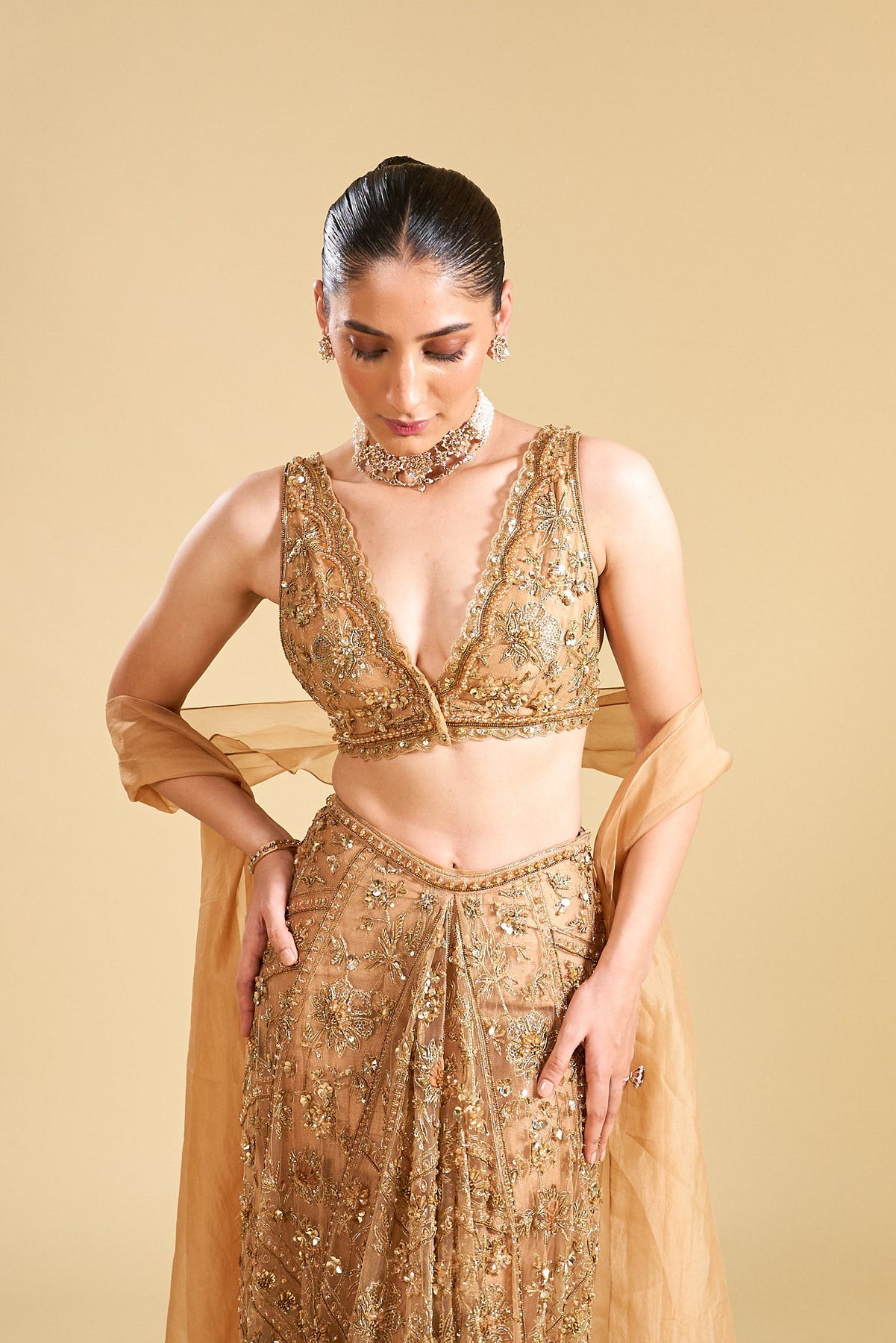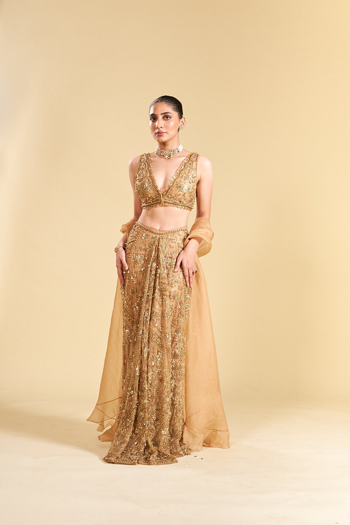 Gold net embroidered blouse and embroidered skirt paired with organza drape