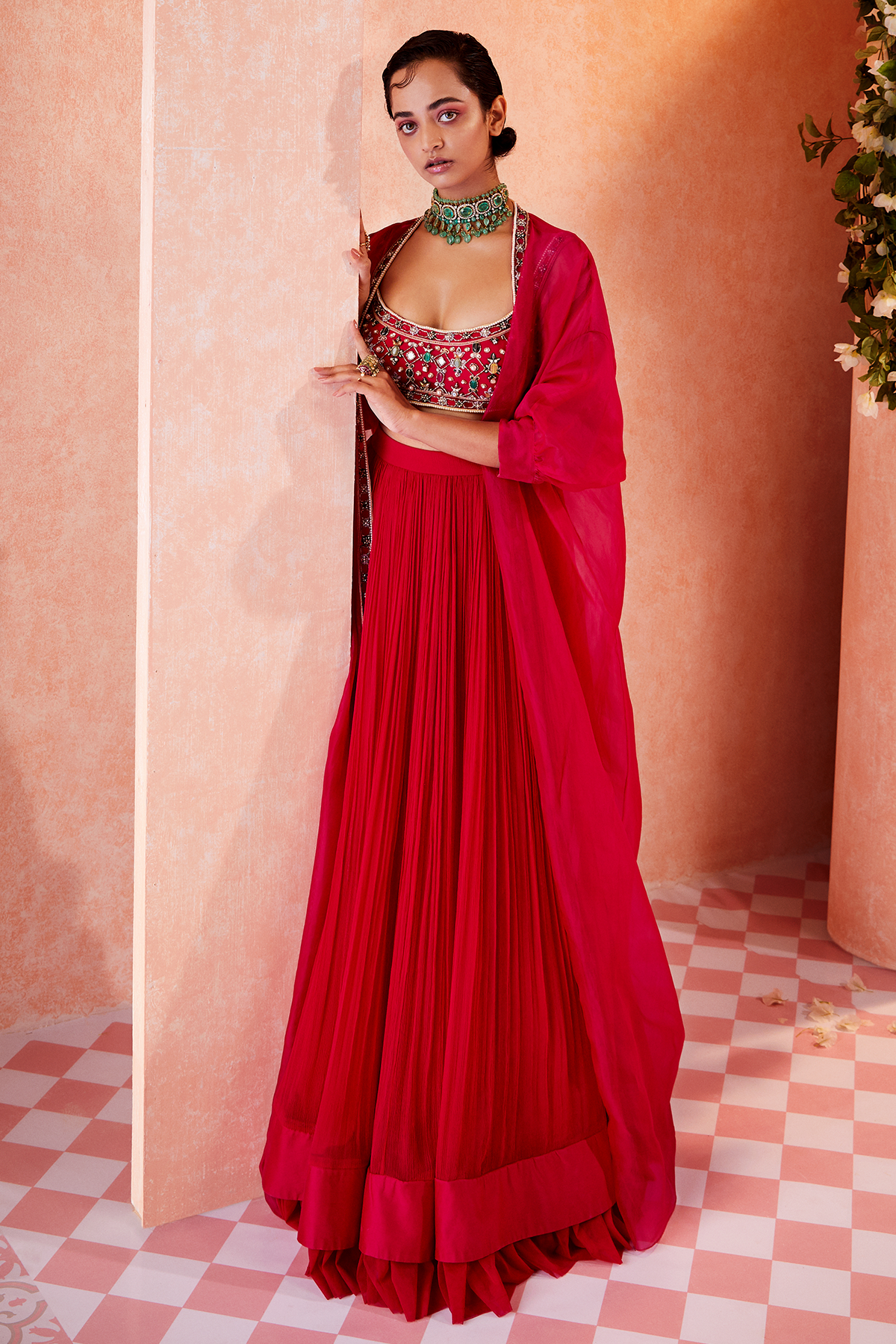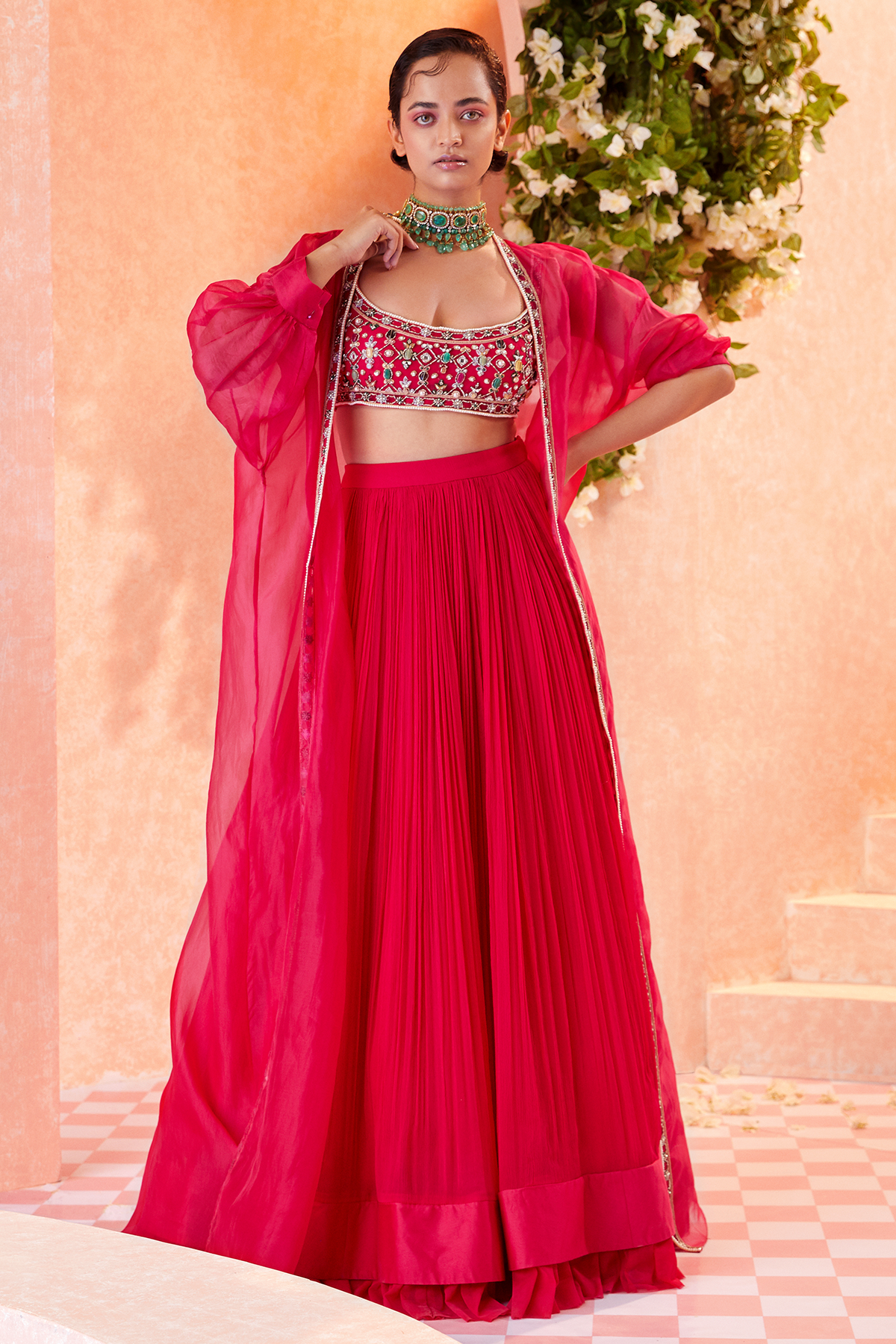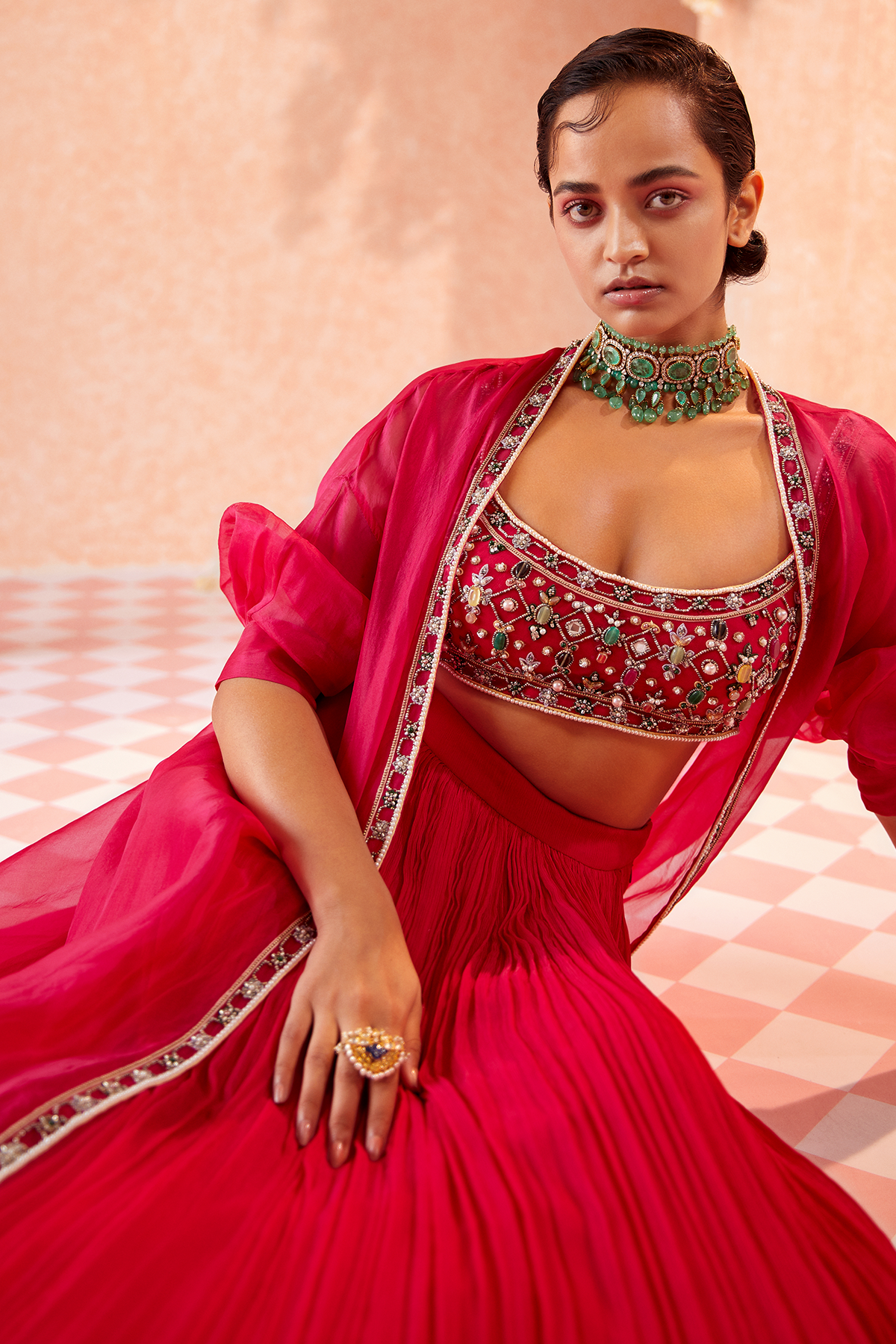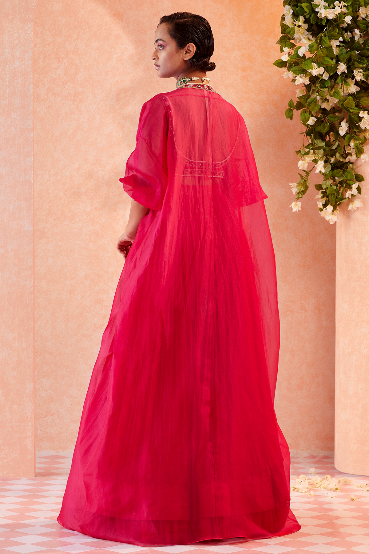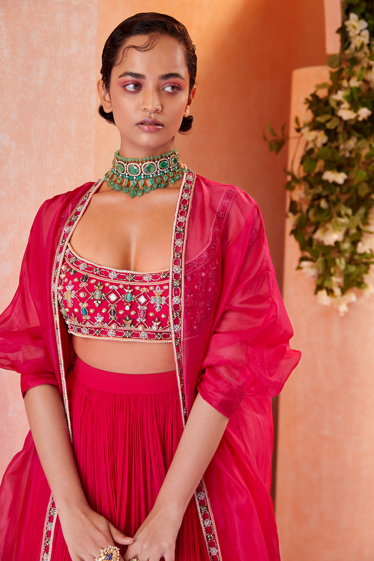 Fuschia net jeweled embroidered blouse and chiffon ruched skirt paired with organza kimono cape