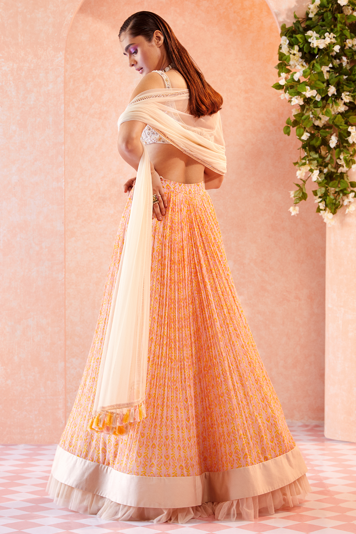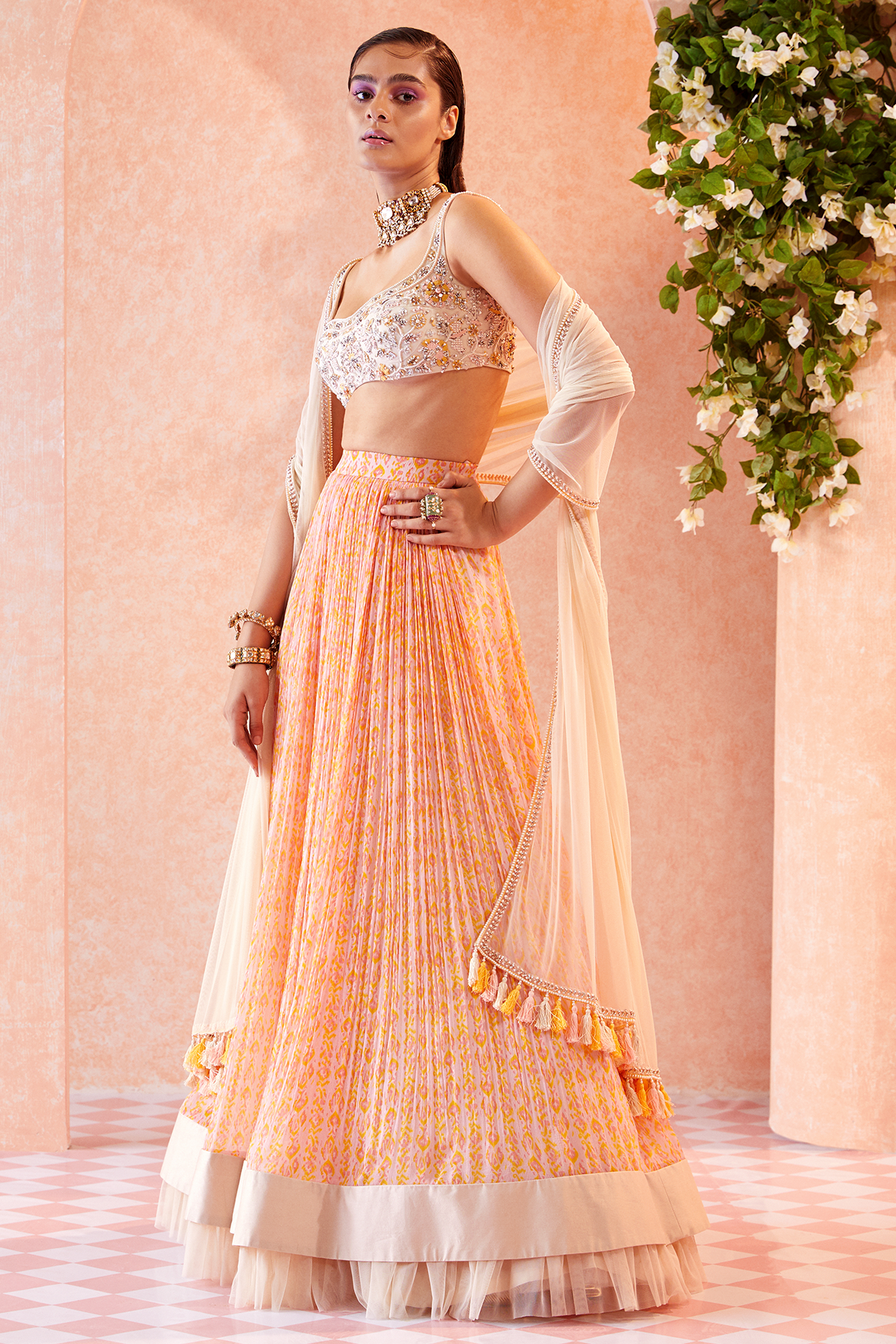 Dirty Ivory embroidered bustier paired with Orchid Pink ikat printed ruched Skirt and embellished dupatta with tassel detailing