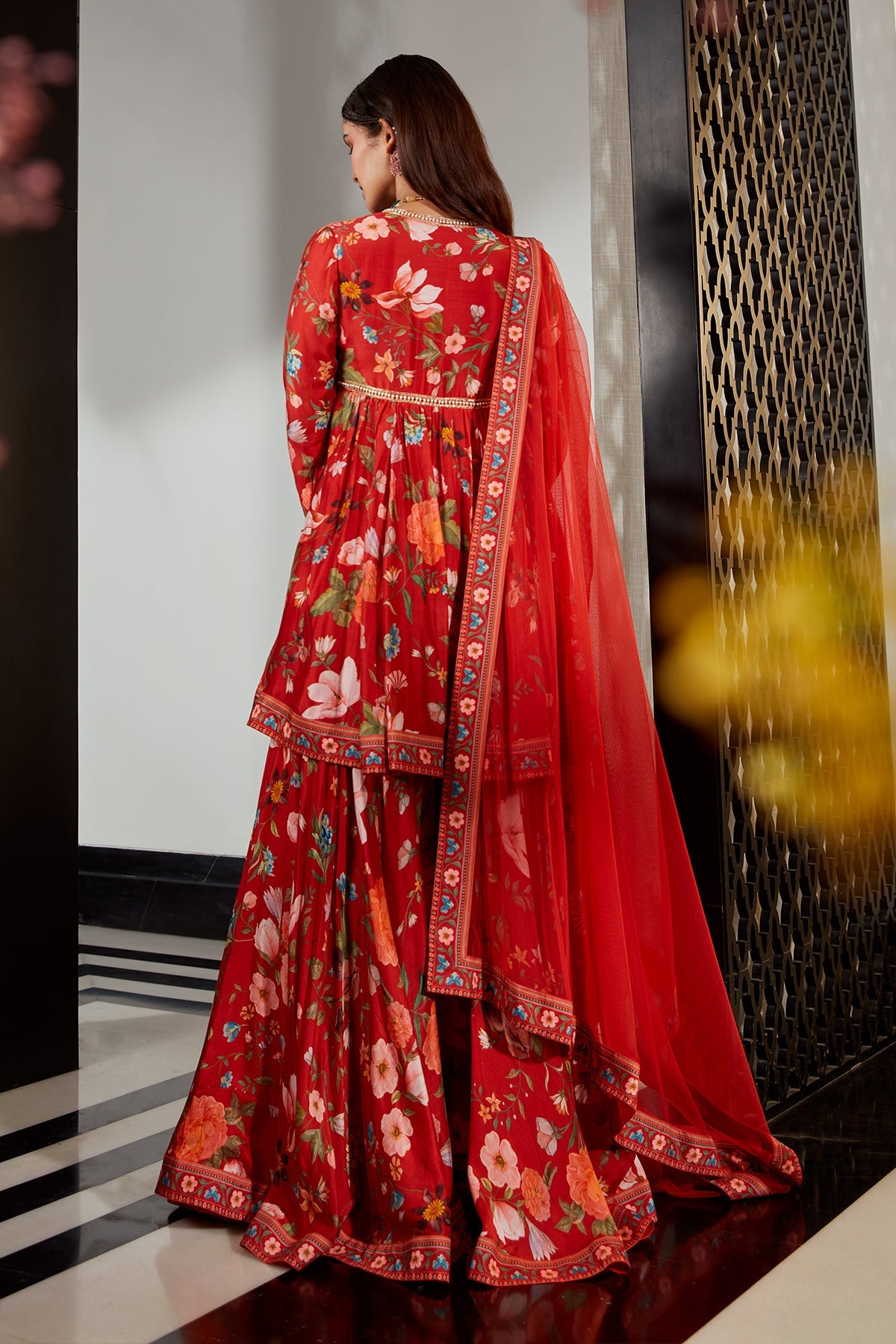 Embroidered printed silk short Anarkali and garara paired with net dupatta