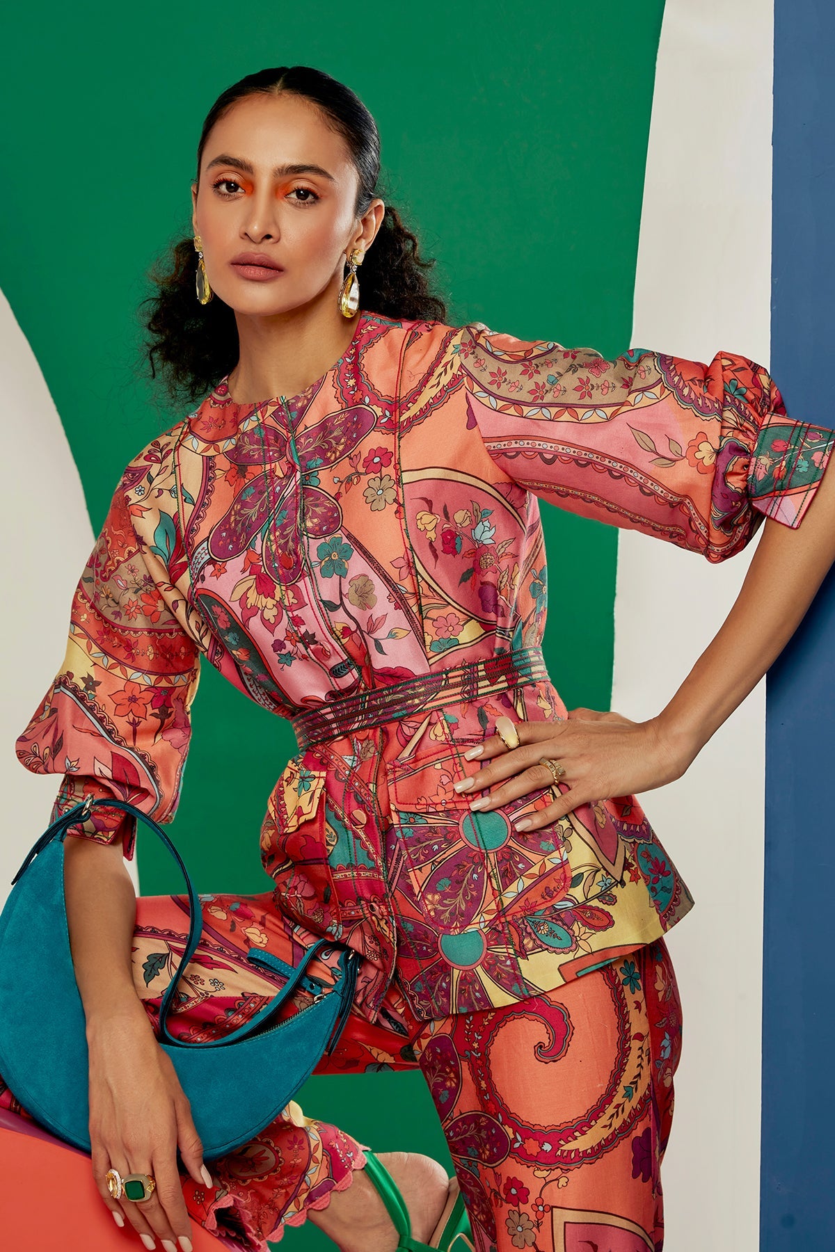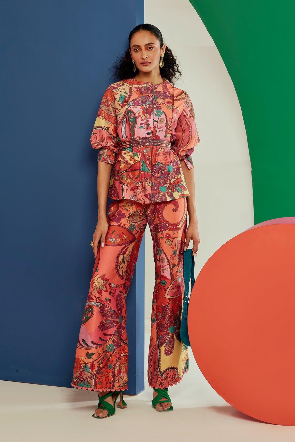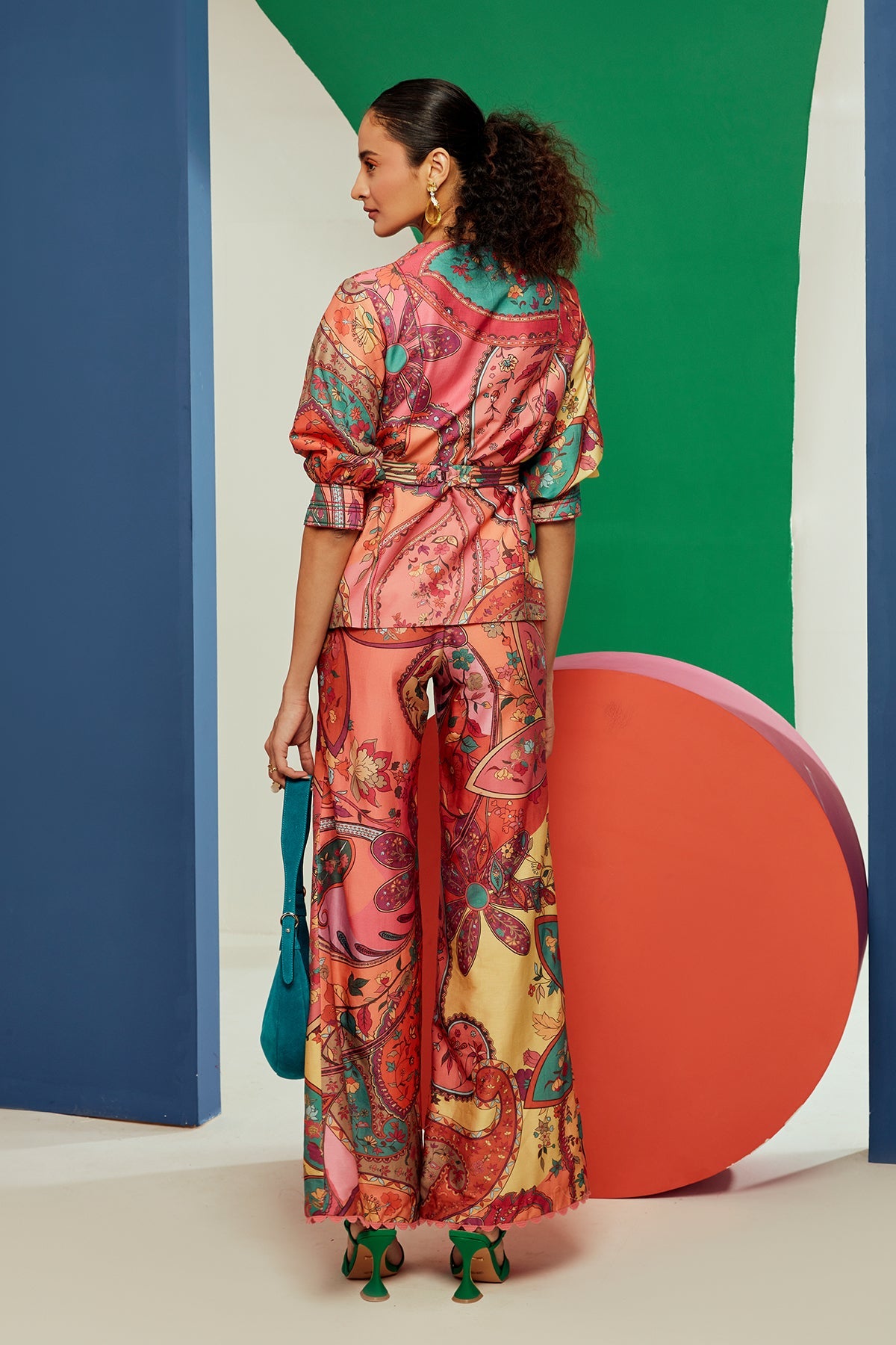 Multicoloured printed chanderi achor detailed shirt and flared pants paired with anchor detailed belt
