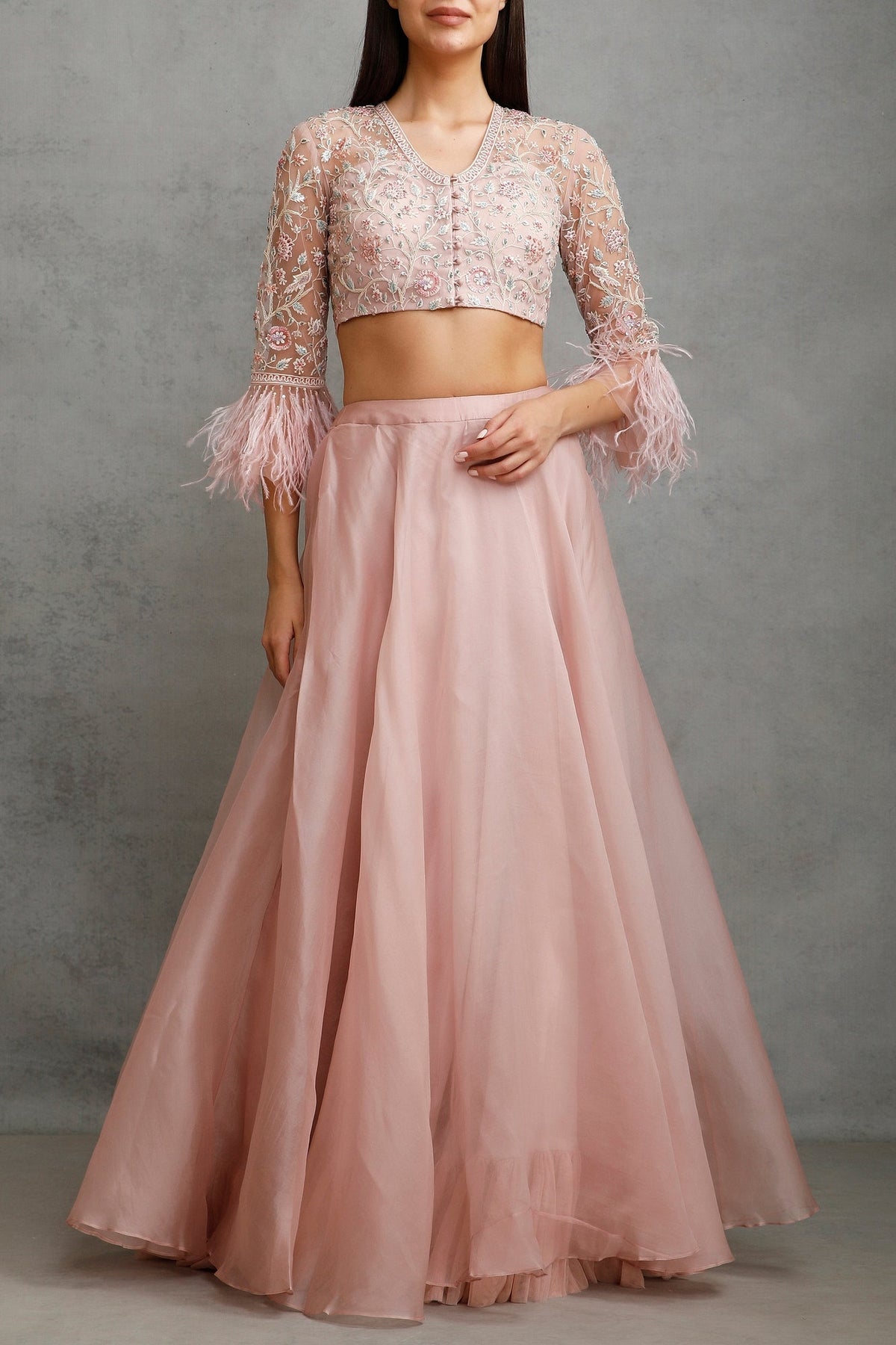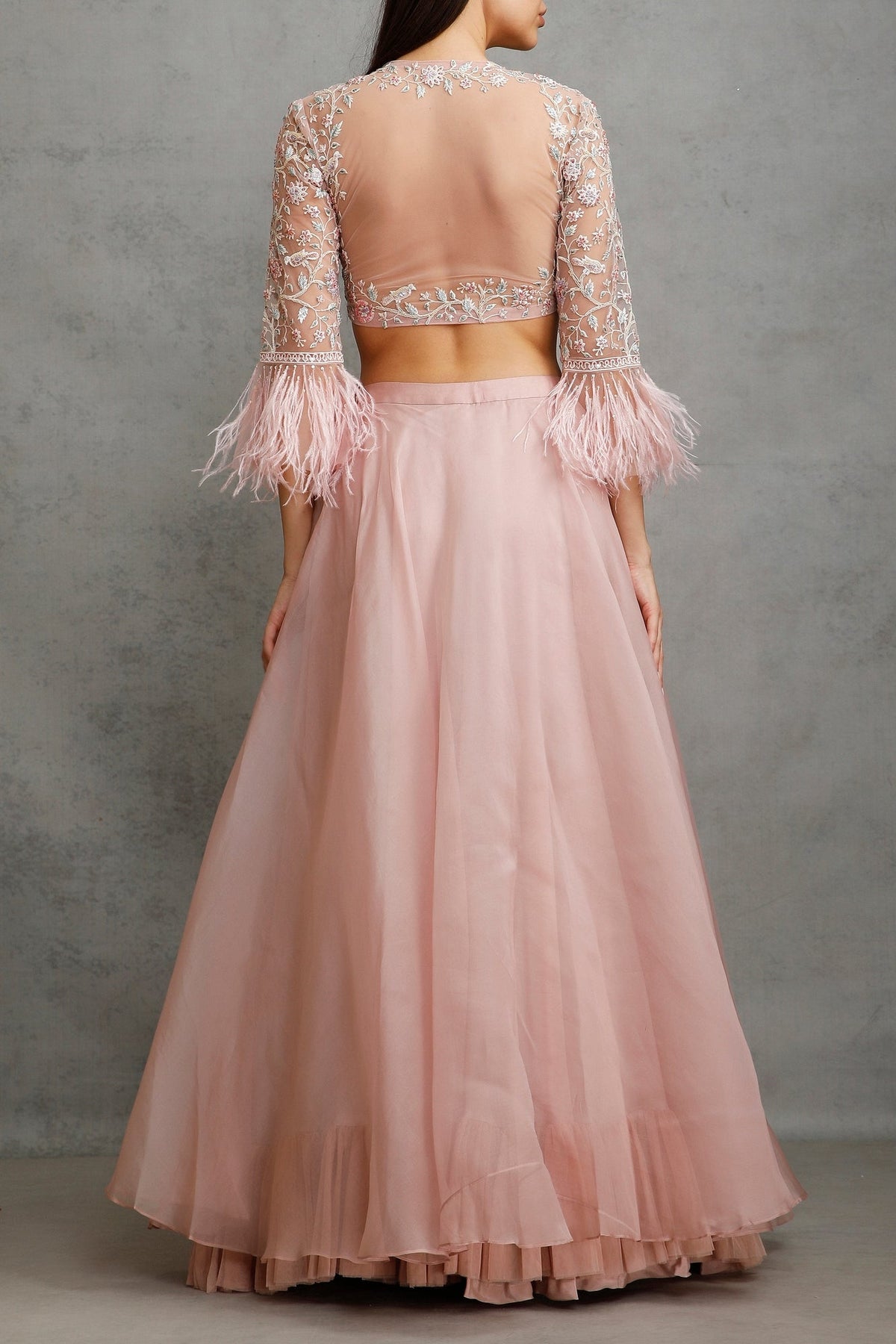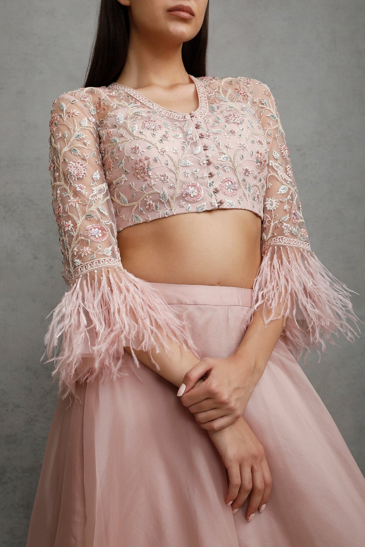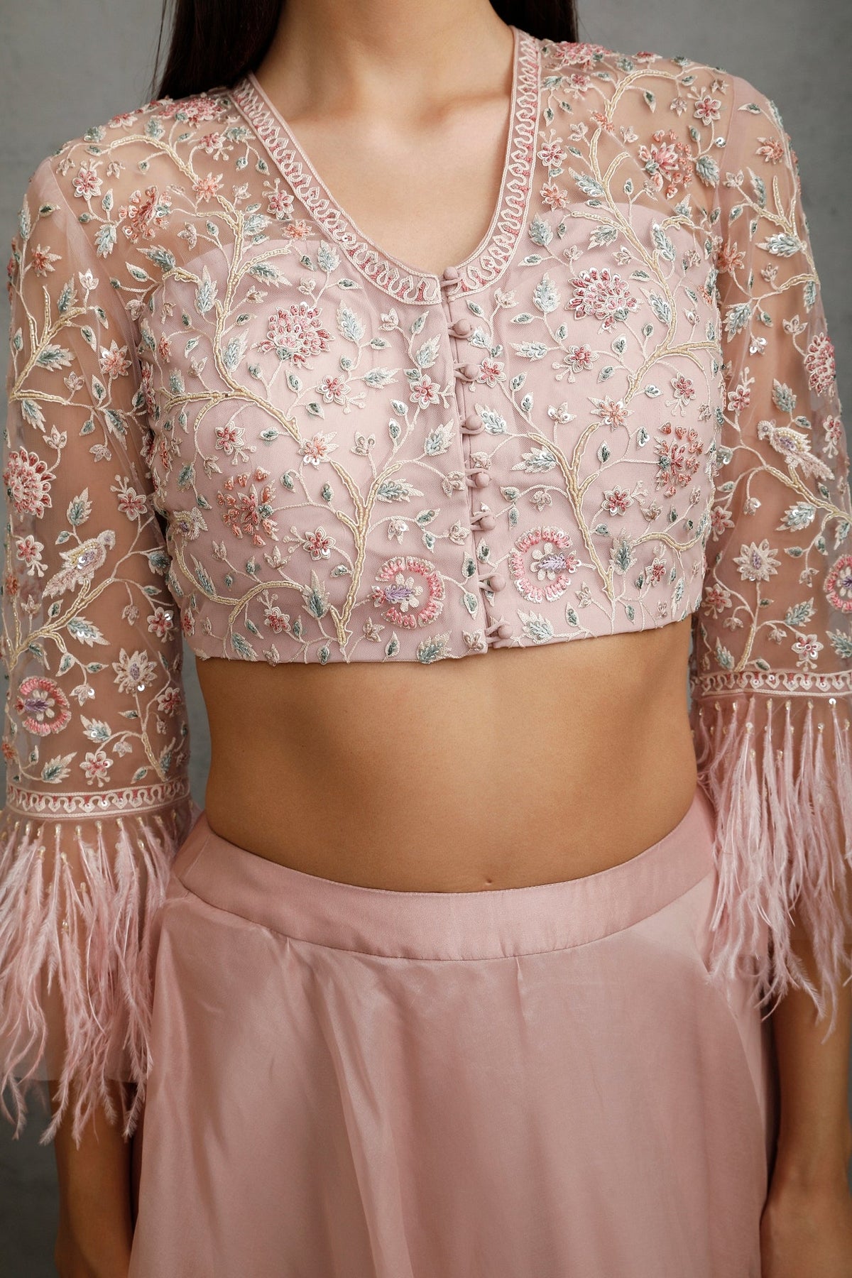 Chintz embroidered Blouse with feather sleeves and organza skirt