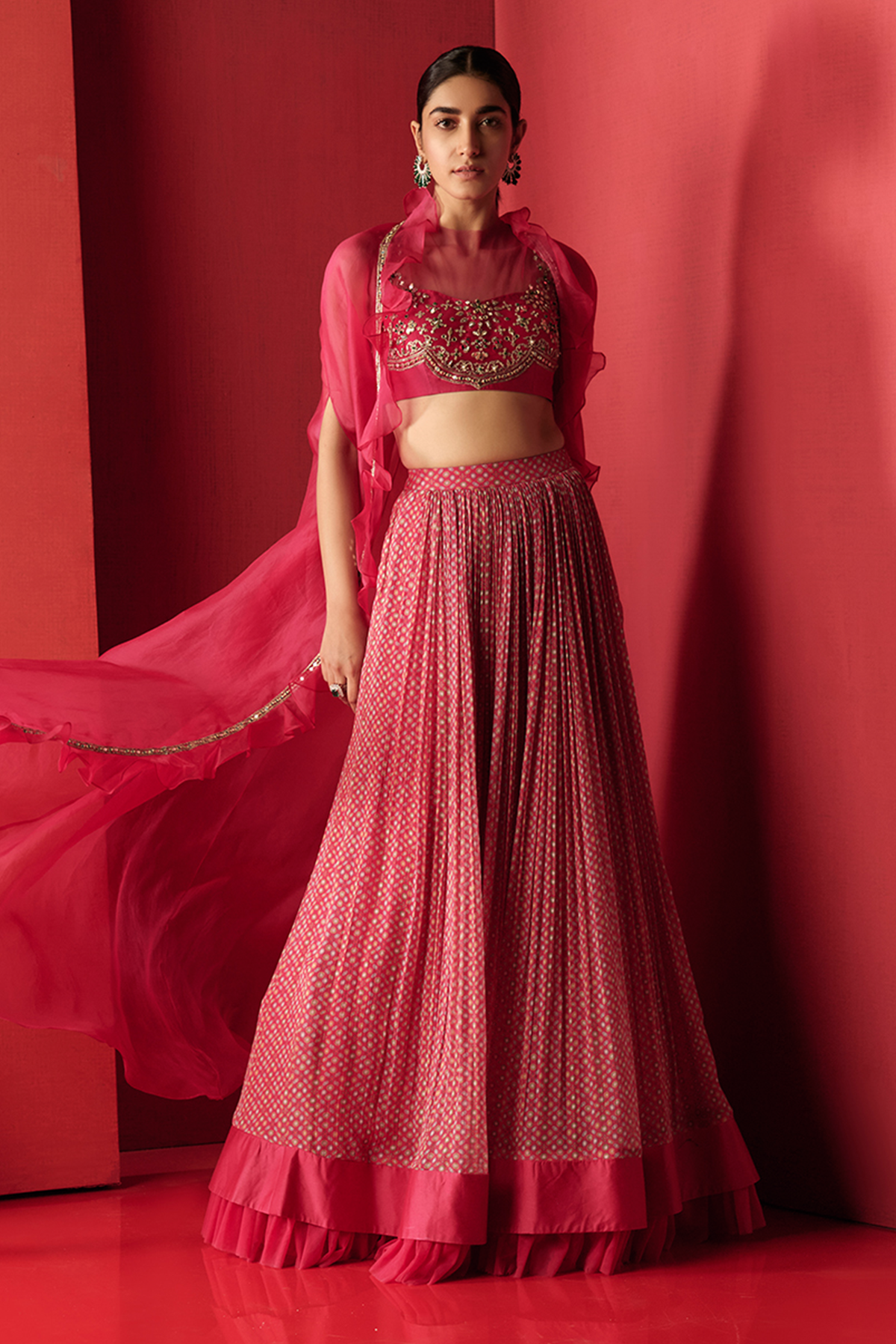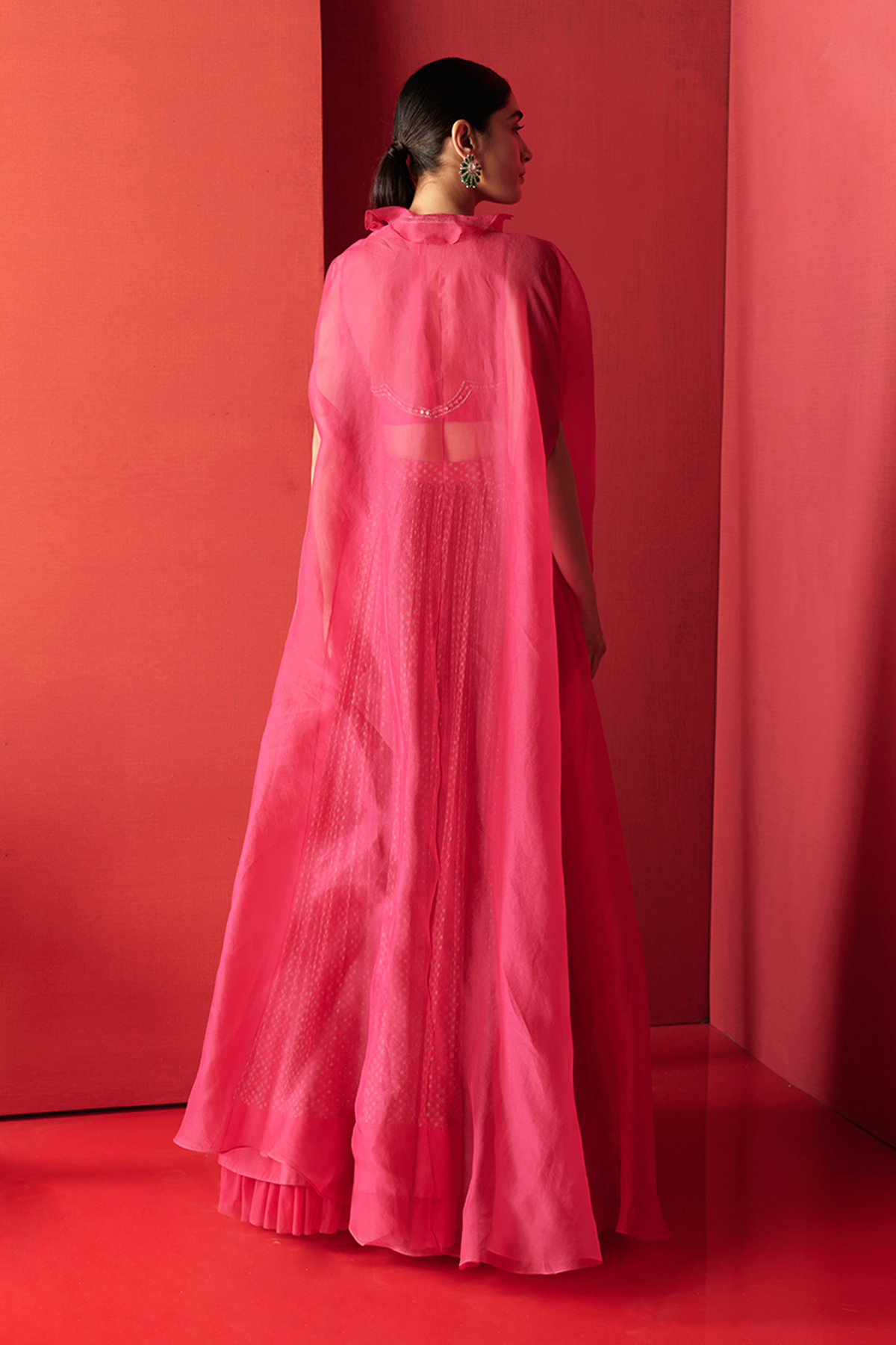 Fuchsia embroidered blouse paired with a folk printed chiffon skirt and an organza ruffled cape