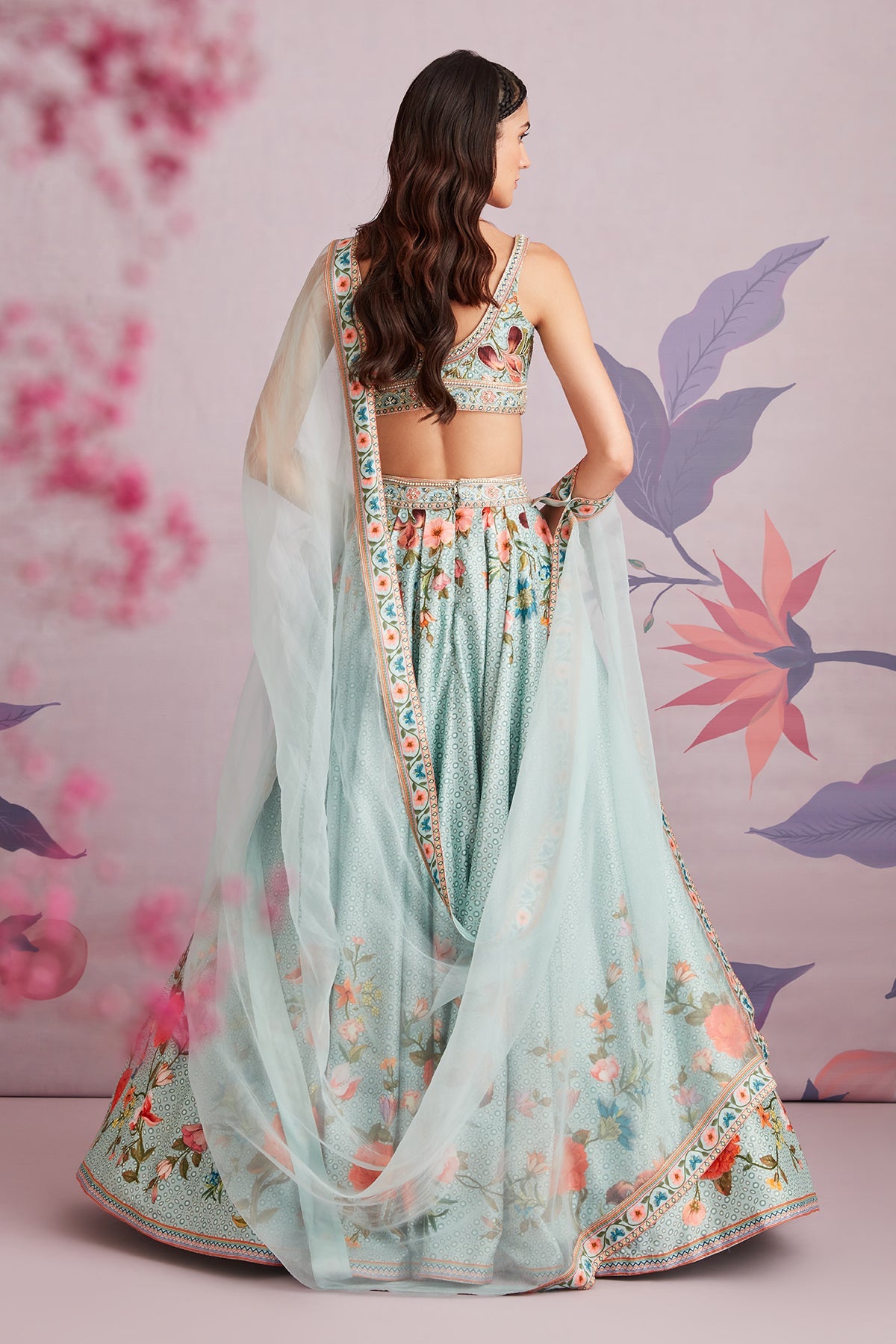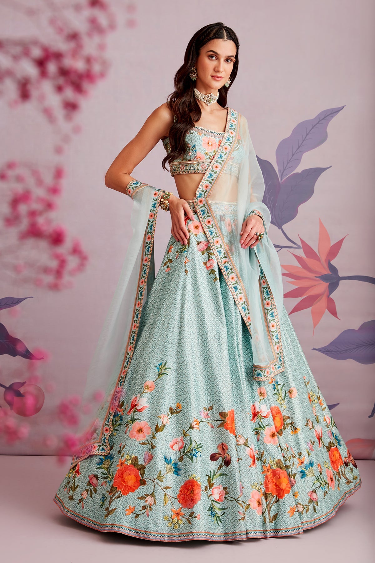 Silk printed embroidered skirt and blouse paired with net dupatta