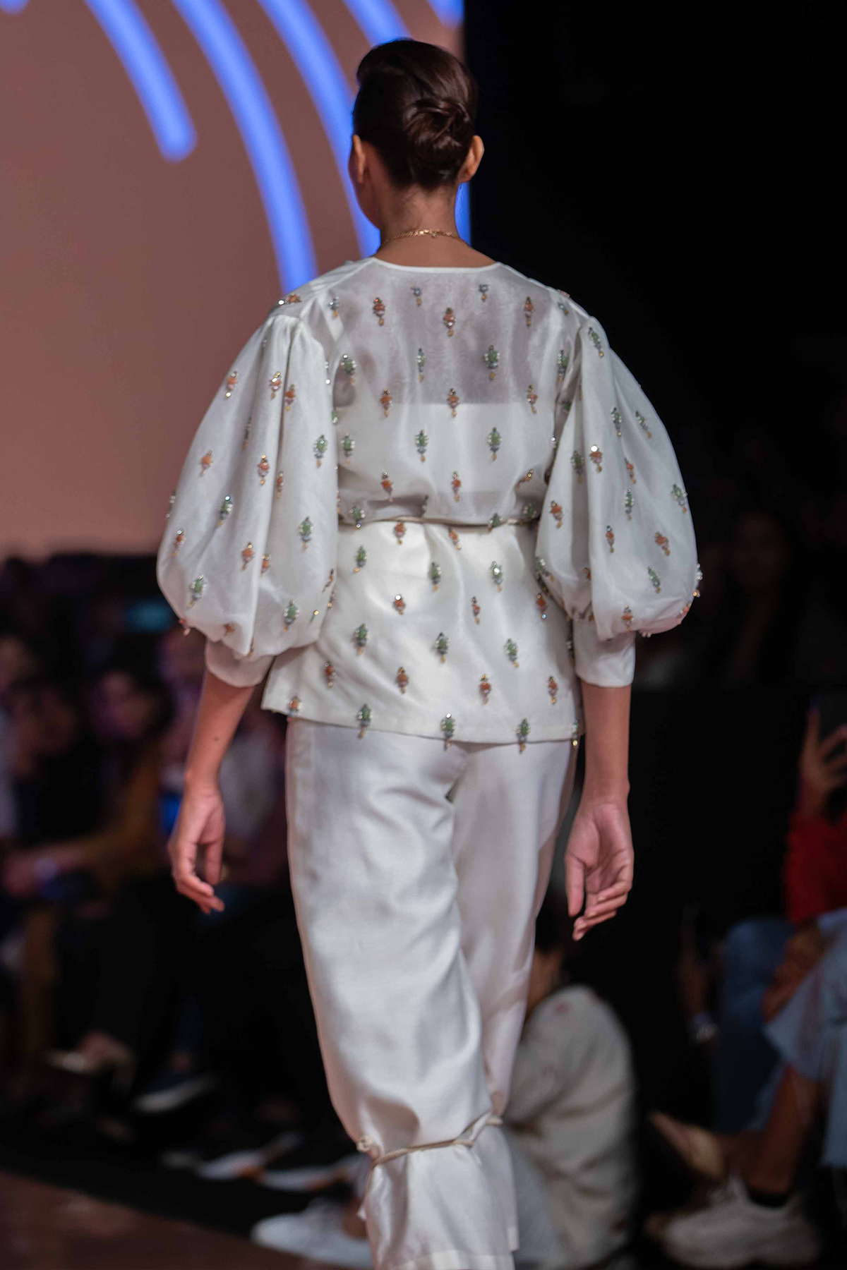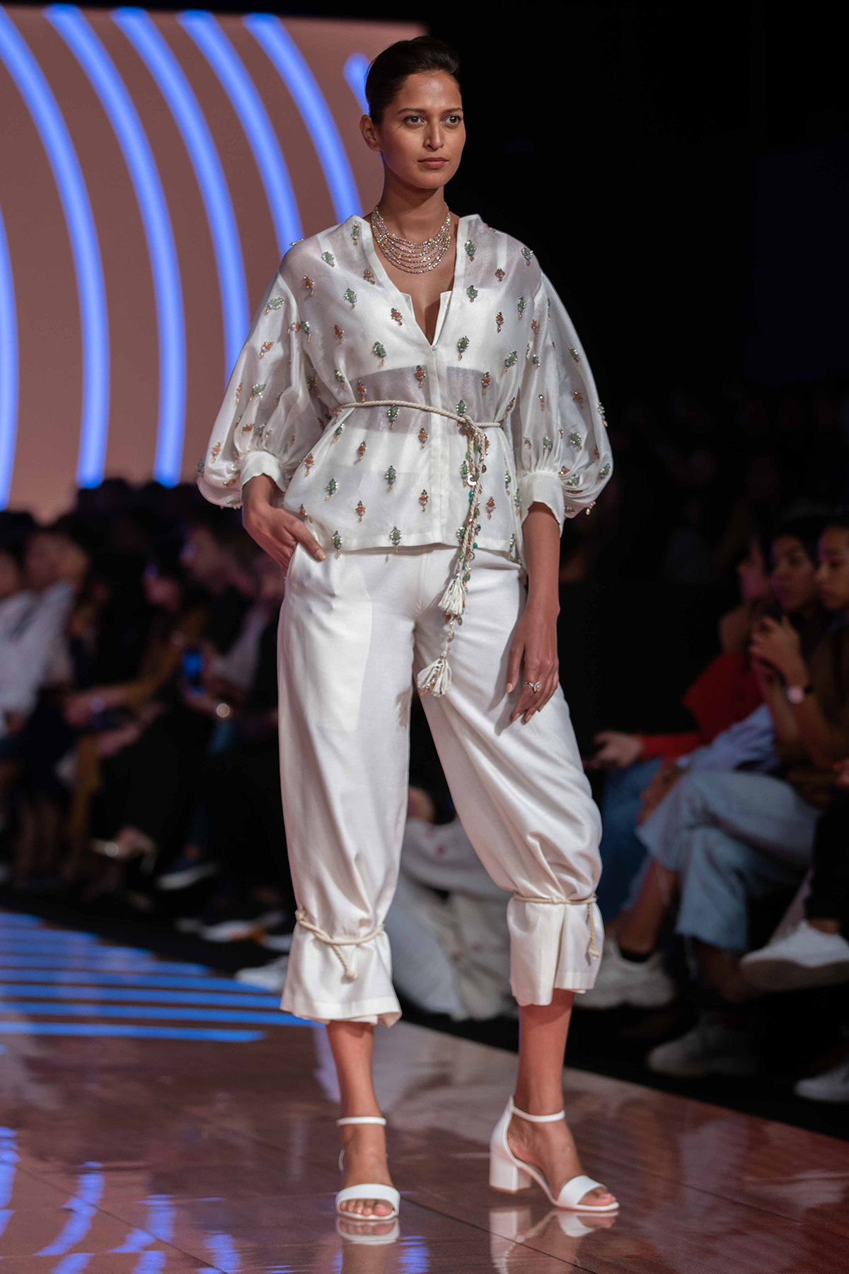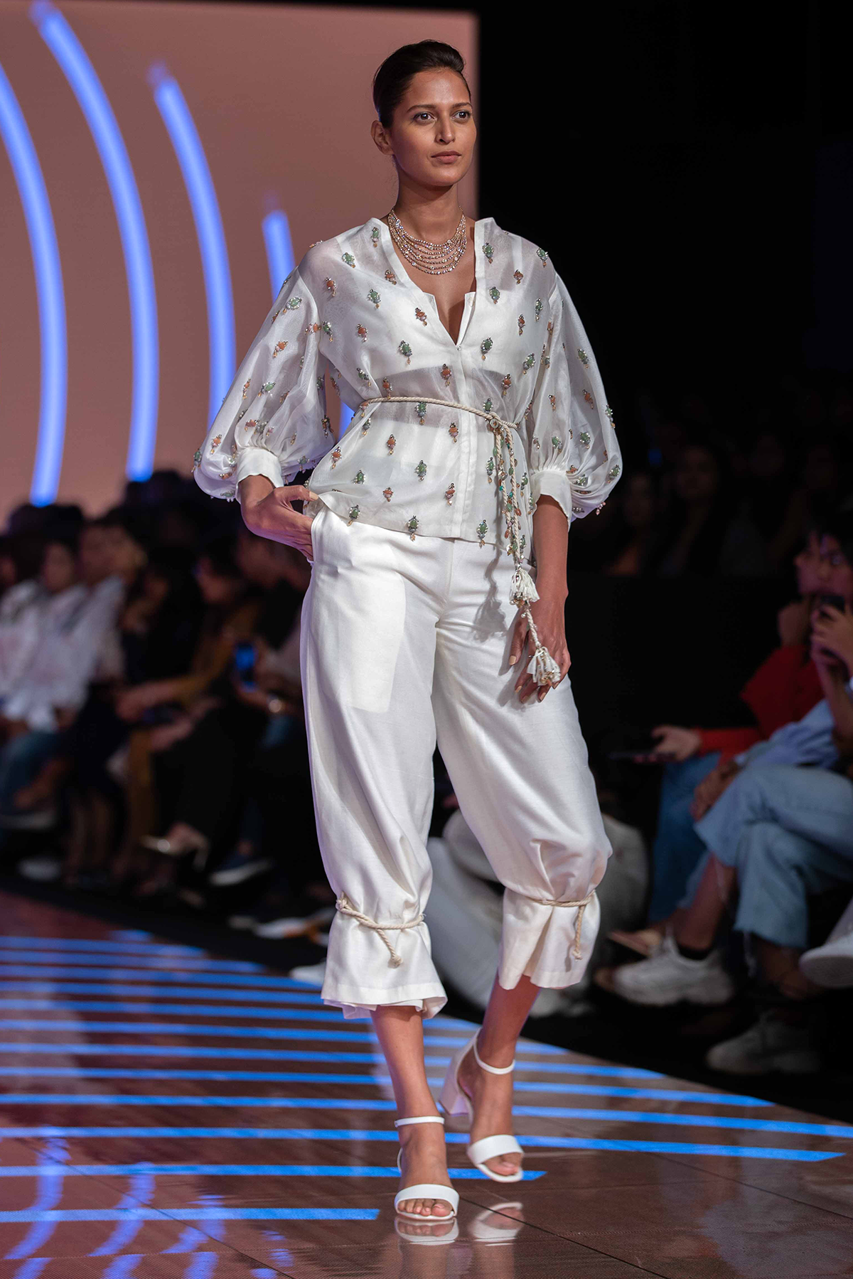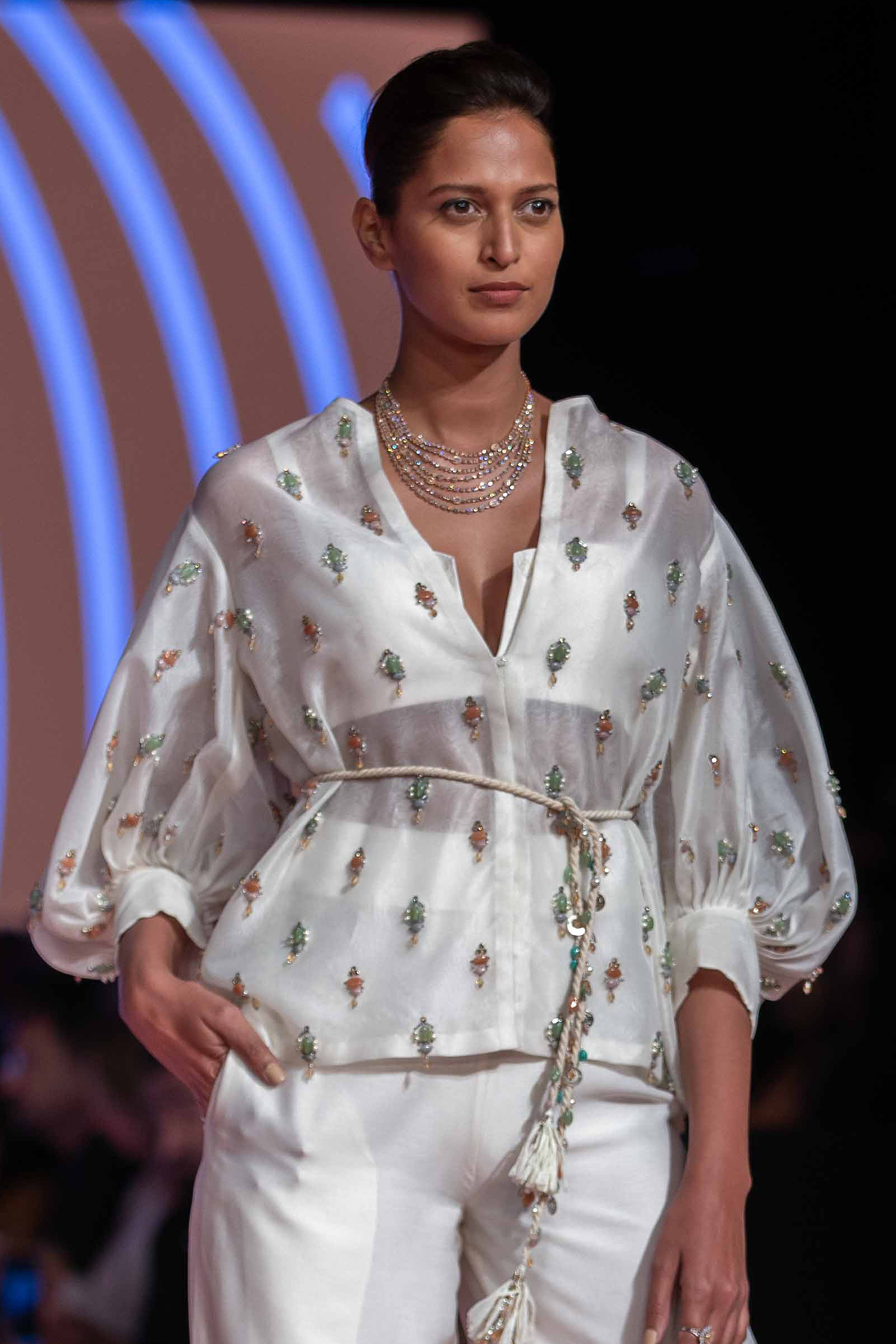 Jewel embellished organza shirt with a chanderi bustier and a rope belt paired with chanderi pants.