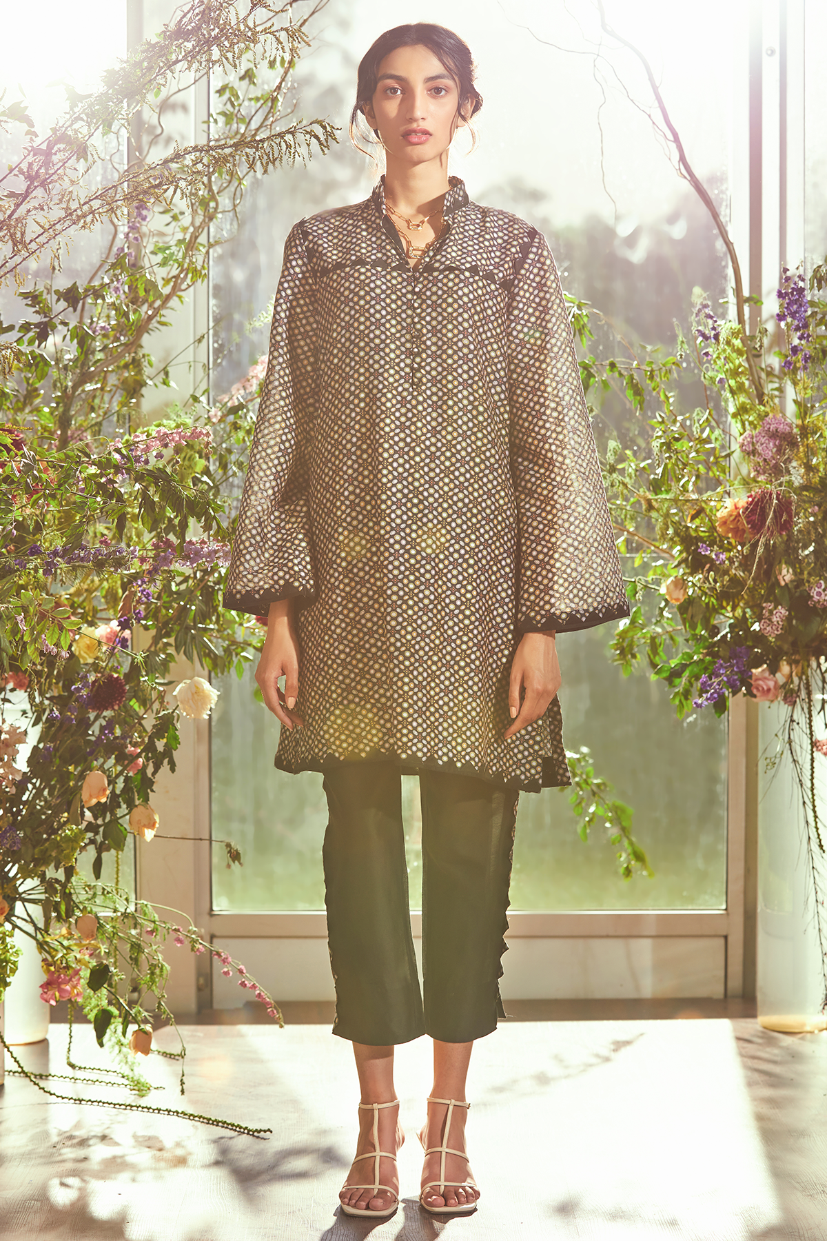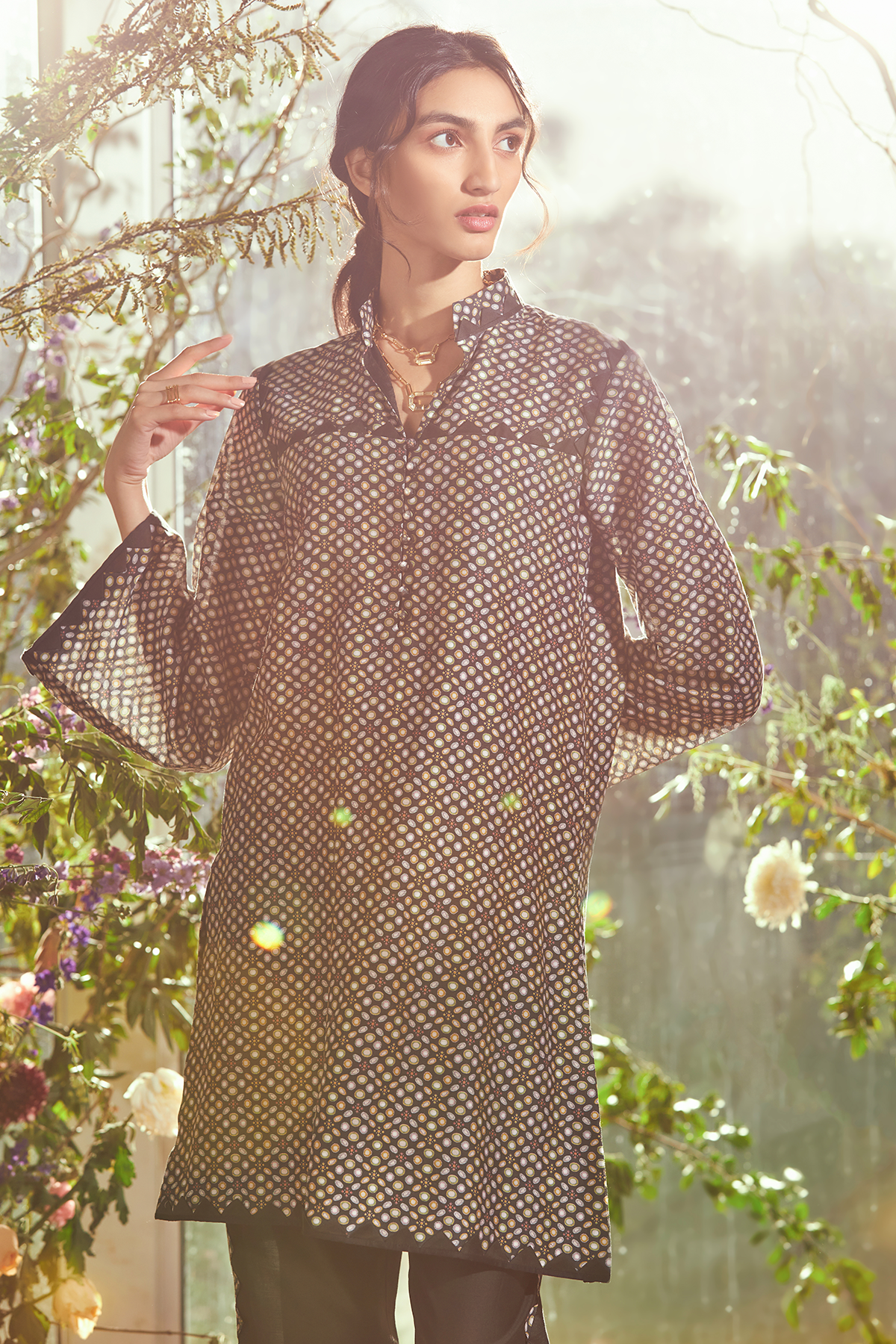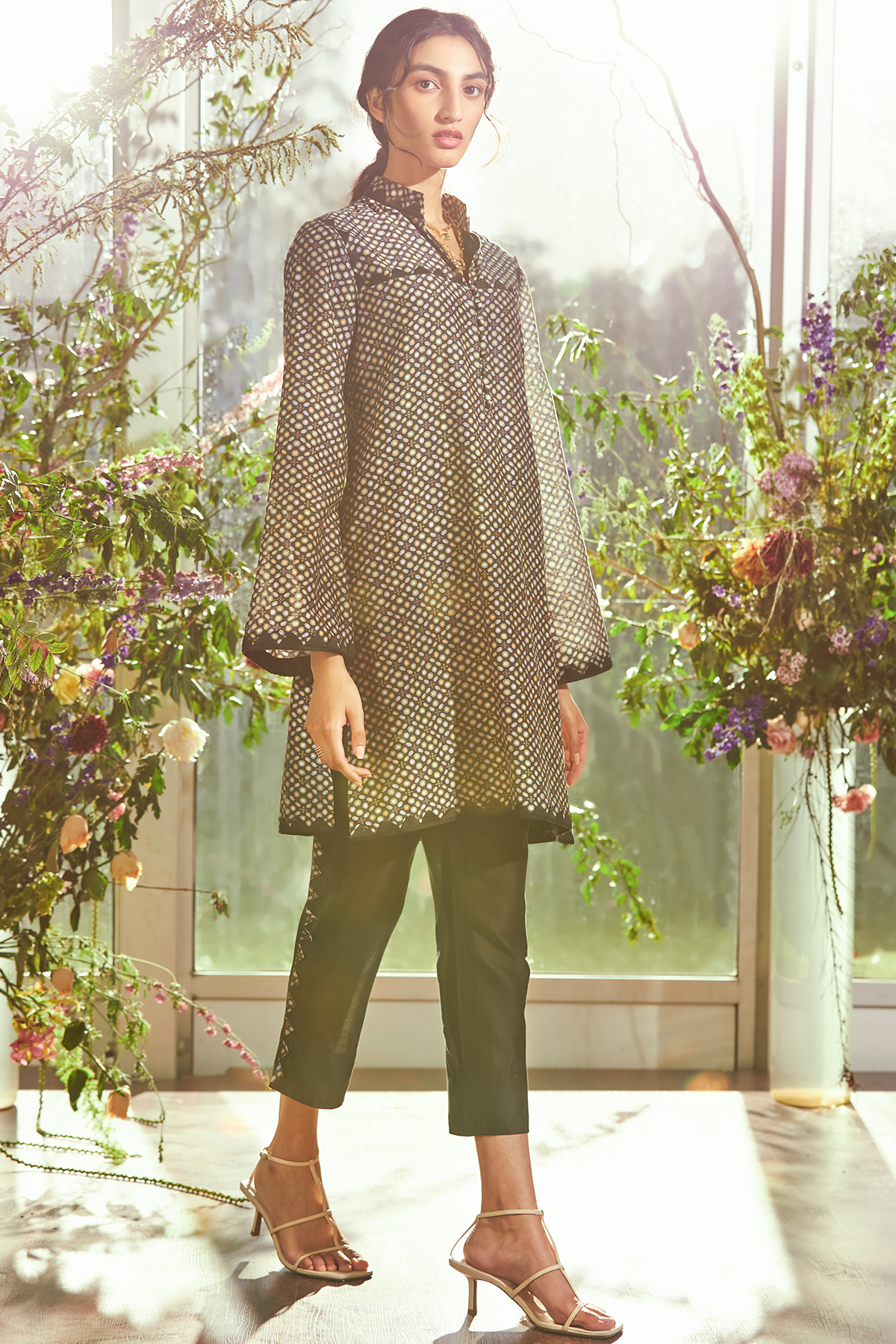 Black folk printed chanderi kurta. Solid chanderi pants.