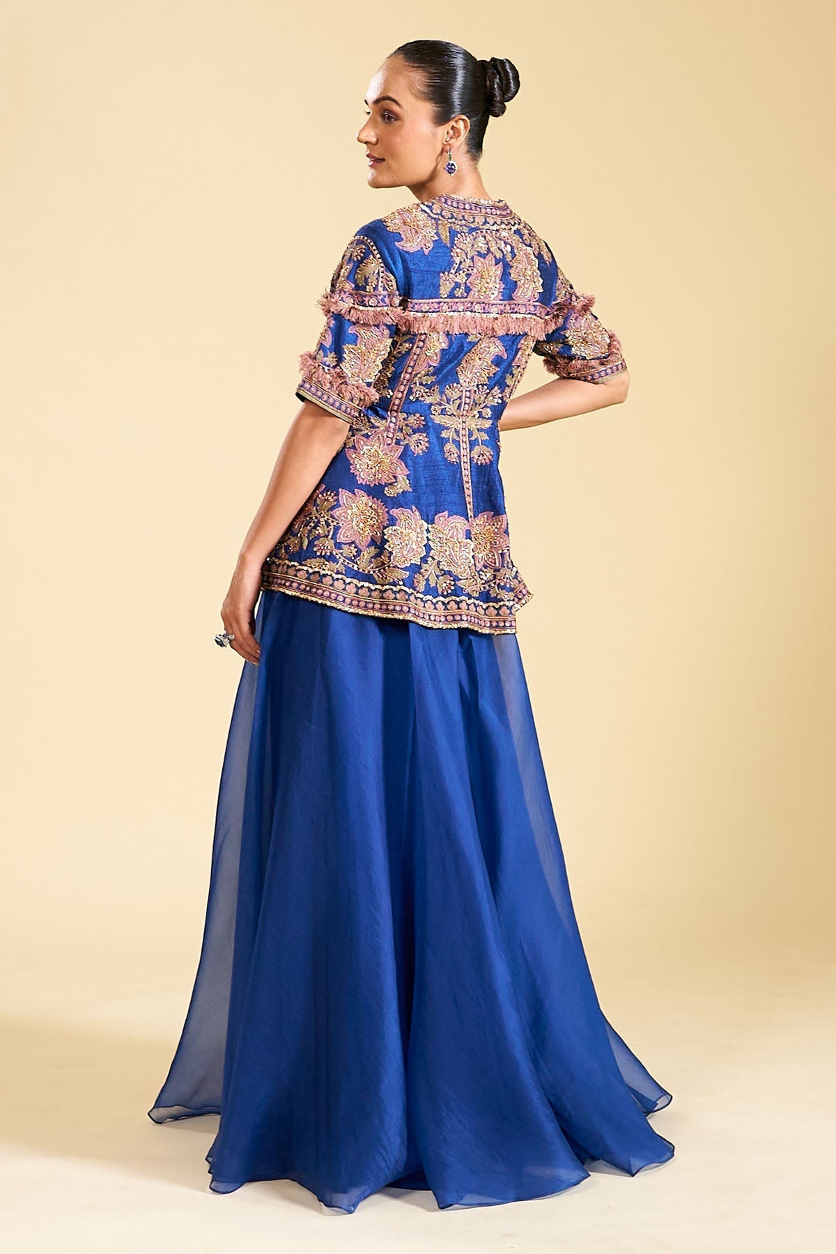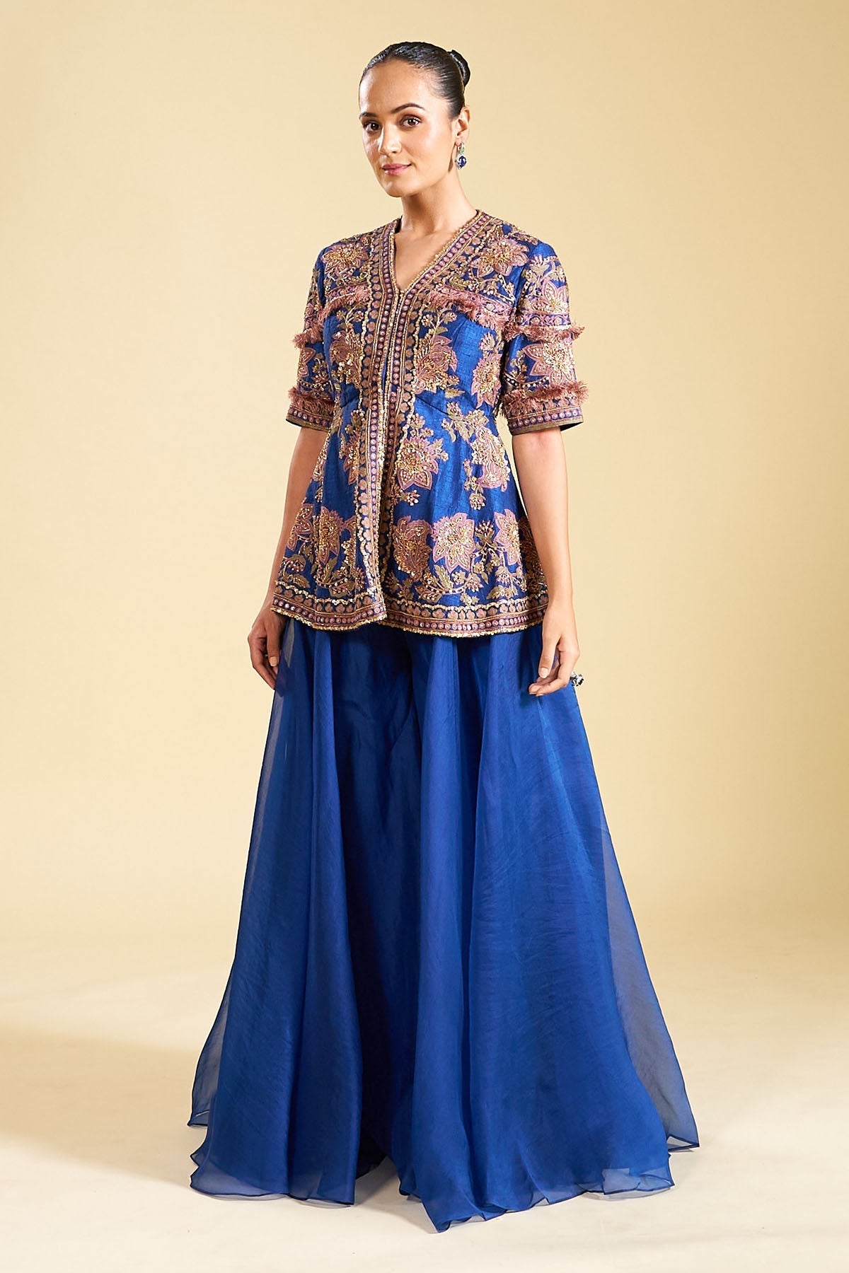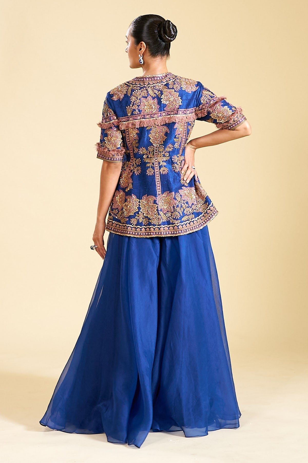 Navy raw silk embroidered jacket and fine silk Gharara with bustier