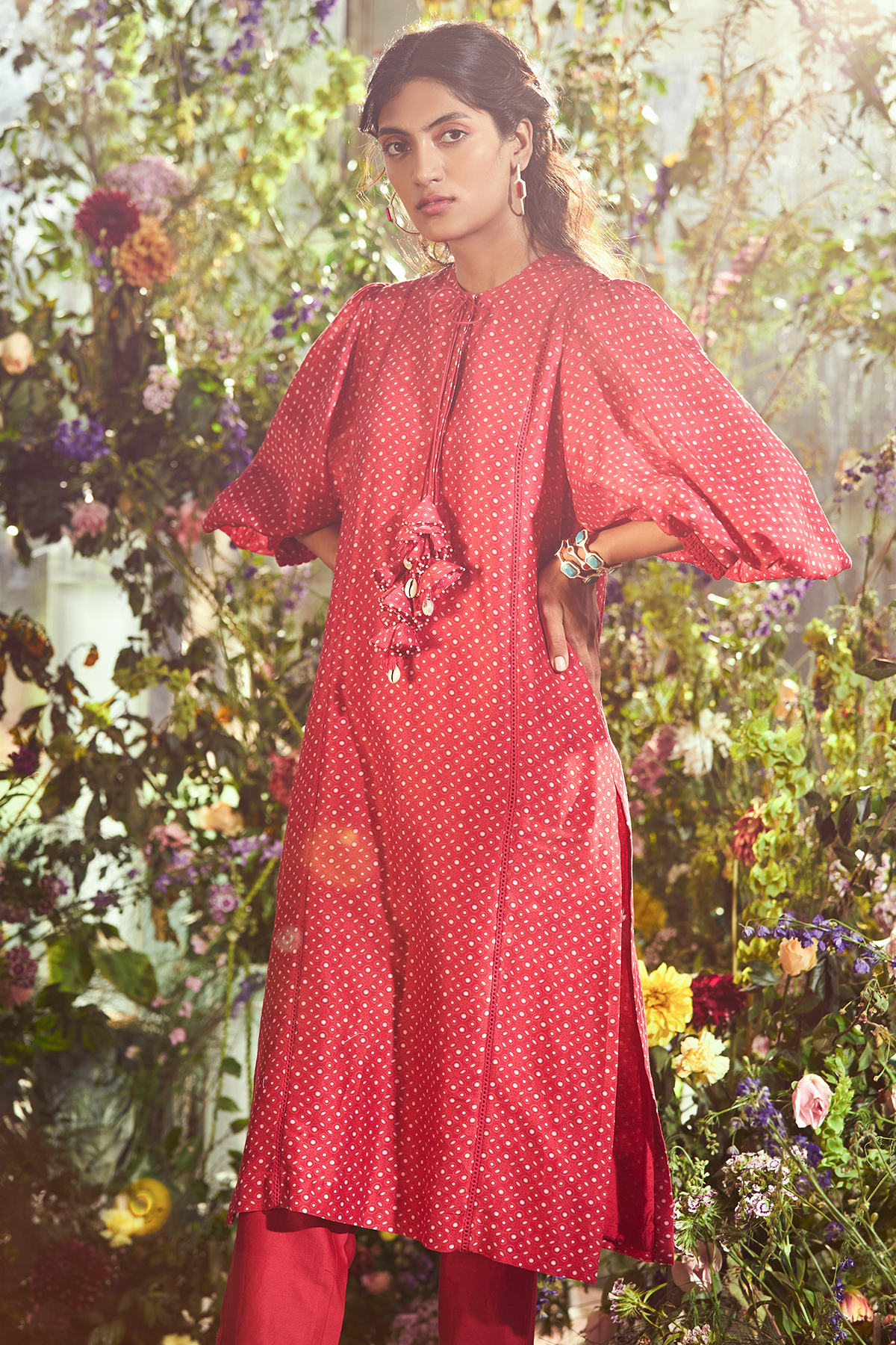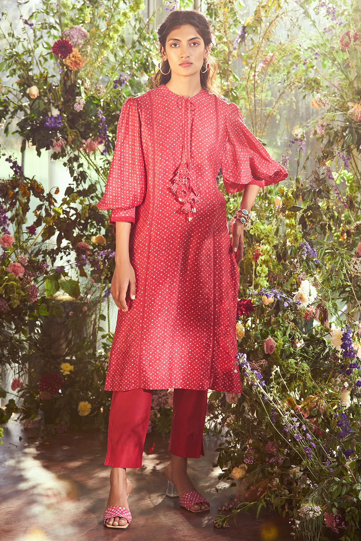 Red folk printed chanderi long kurta. Solid chanderi pants.