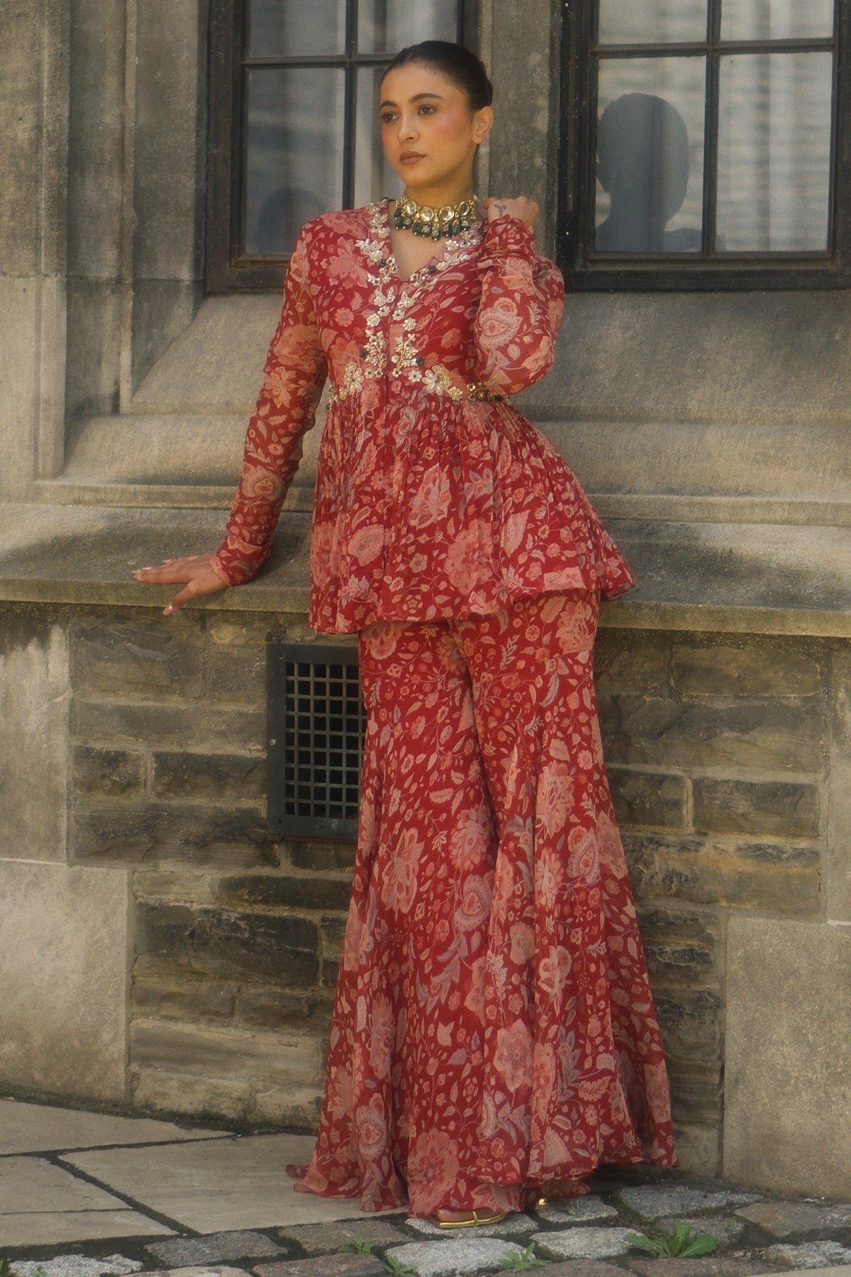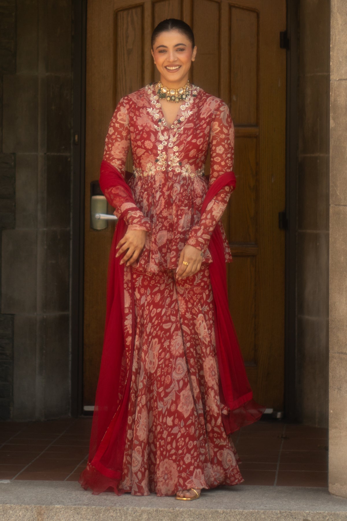 Red Printed Chiffon Peplum Paired With Printed Chiffon Gharara and Net Dupatta