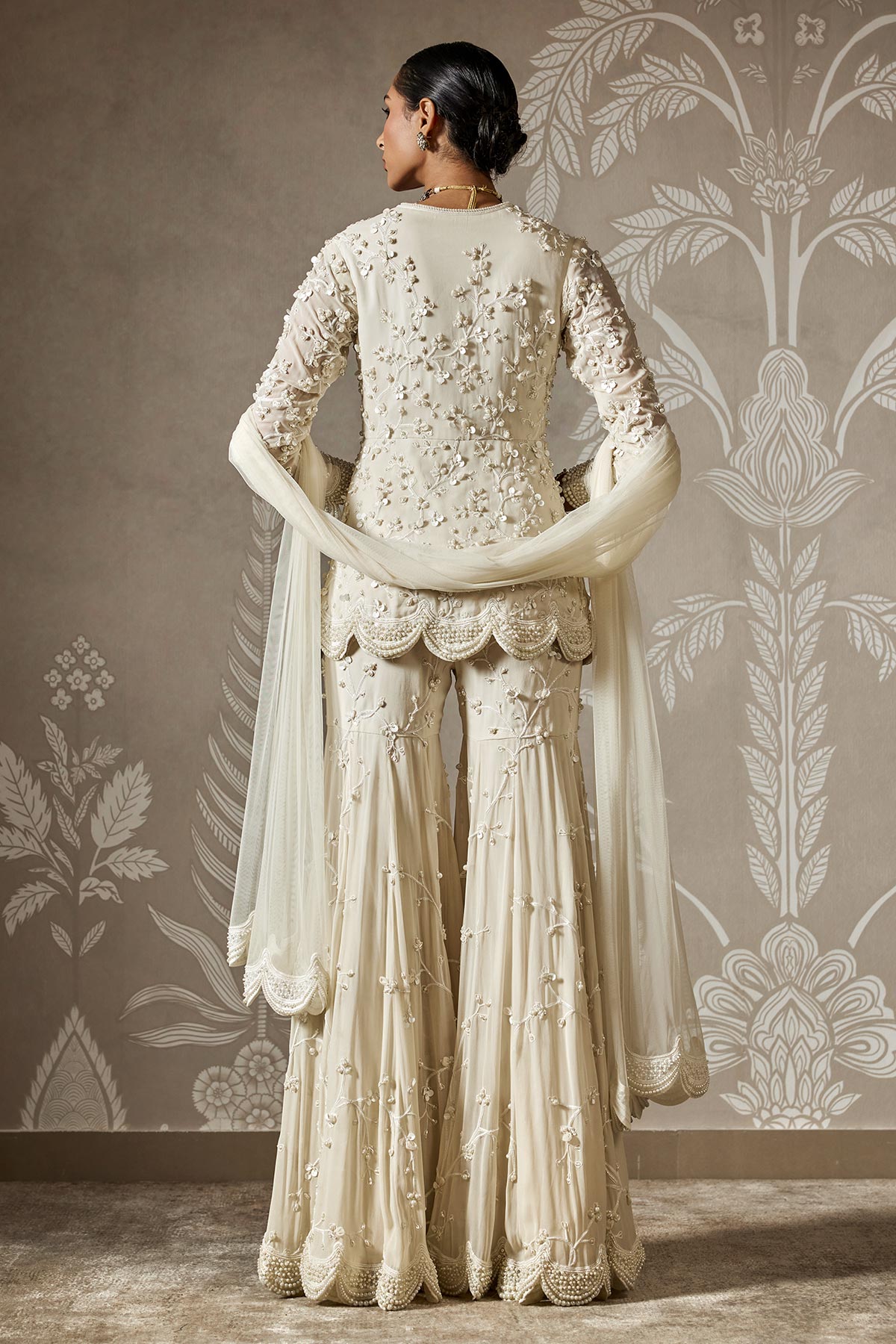 Allover Embroidered Georgette Peplum and Garara Paired with Two Side Embroidered Border Net Dupatta