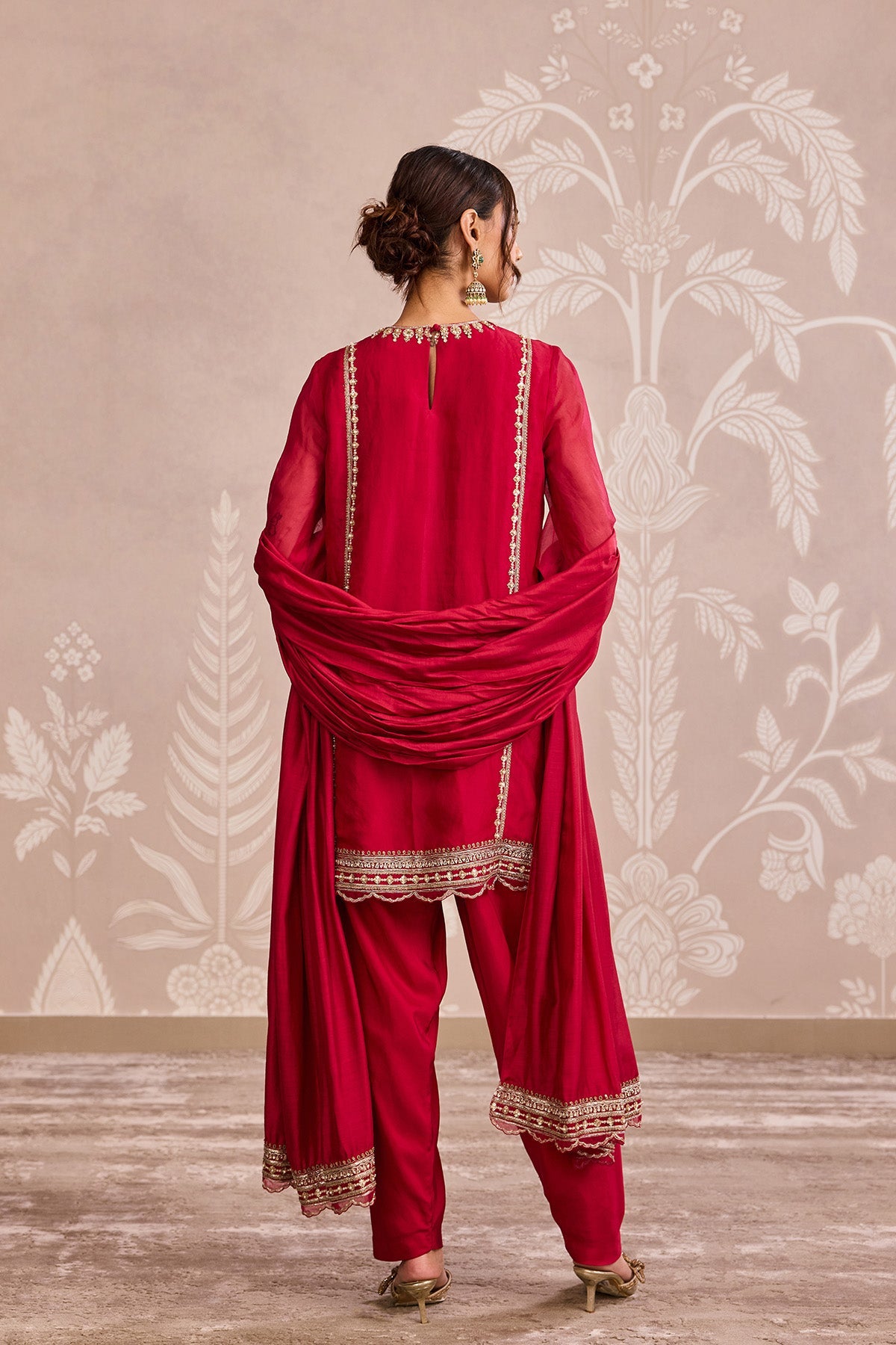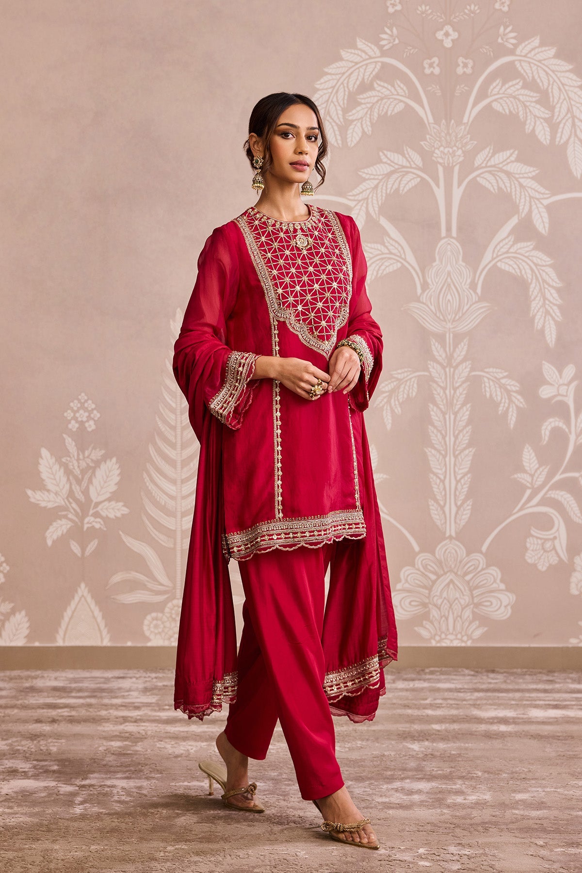 Placement Embroidered Organza Kurta with Plain Silk Salwar, paired with a Two-Side Embroidered Border Silk Dupatta.