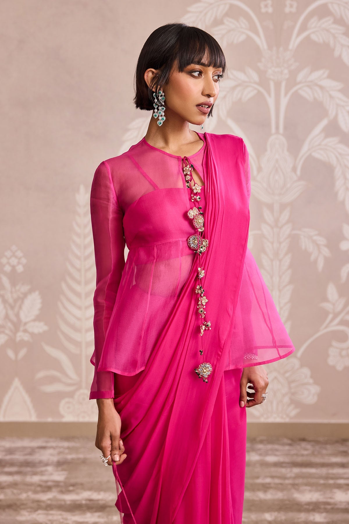 Organza Front-Open Peplum Jacket, enhanced with Floral Embroidery and Bustier, paired with a Georgette Flat Ruffled Saree and Crepe Petticoat.